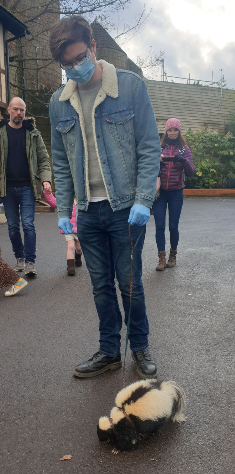 Then we got the chance to actually take Flash for a walk! Or, more accurately, Flash got the chance to walk us. To keep things as chilled for the skunk as possible, we were instructed to keep the leash slack at all times, meaning that Flash was able to scurry around anywhere and everywhere he wanted – the best kind of chaos! The brilliant staff kept him as focused as possible, with a constant supply of mealworms but with so many distractions in a busy park, he wasn’t always set on the most direct route. This part of the experience understandably attracted quite a crowd of families gathering around to get a look at the skunk, with many children rushing up to pose next to us for a photo. If you really hate attention, perhaps this isn’t the experience for you.