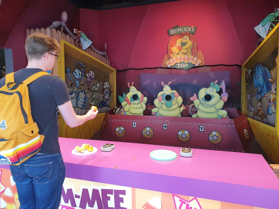 With Midway Mania complete, we thought we’d get the full boardwalk experience by trying our hand at some of the real-life midway games. At $5 a go, they weren’t super cheap but hey, we were at Disneyland. Ignoring everything else, I ran straight over to Heimlich’s Candy Corn Toss. This game looked hard, but the potential pay-off was huge – they had Francis and Flik plushes! A Bug’s Life is an underrated masterpiece and I’m devastated I never got to experience A Bug’s Land, so even just the potential to win some merchandise is a sure way to get me to drop those dollars. I’d give anything to hear the Bug’s Life Suite in a theme park… anyway.