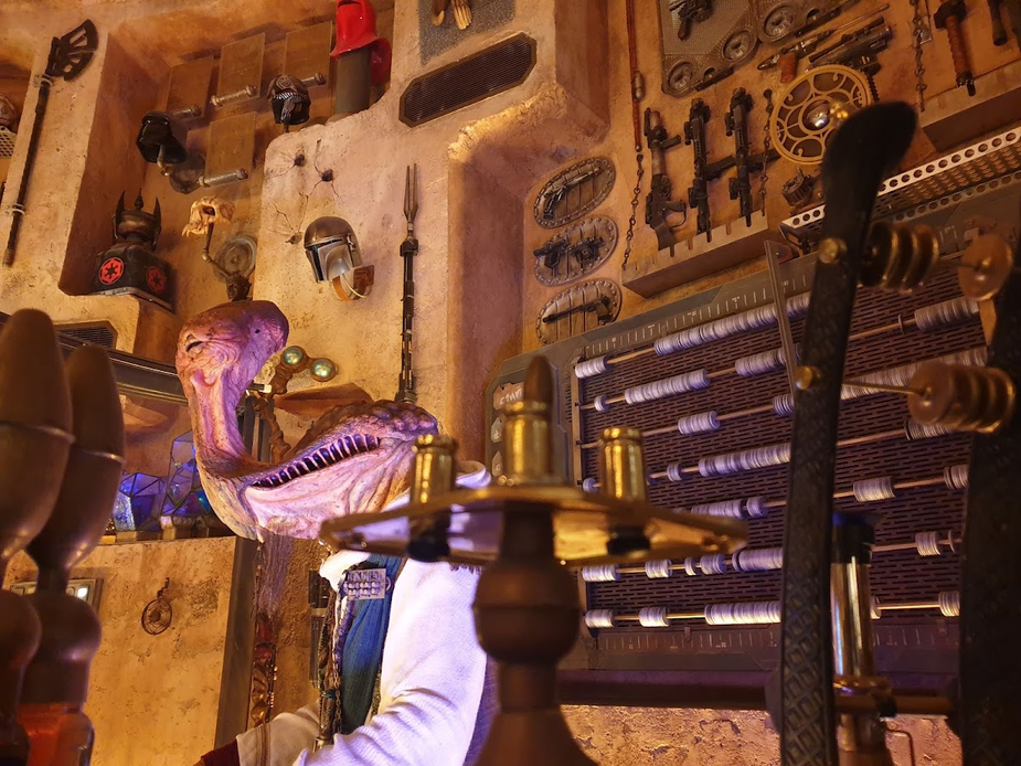 Before I can talk about Batuu as a land, I first just need to say that I’m still not convinced it belongs within Disneyland and its disruption to the classic layout continues to frustrate me. Is that a spicy take? Does that make me a stick in the mud? I’m not sure and it really doesn’t matter as the land is here to stay. Anyway, despite my thoughts on its presence within the park, the entrance points into Galaxy’s Edge are so well designed that it didn’t feel out of place when I was actually there which is the main thing. But that’s not what I’m here to talk about, at least not entirely. What truly took me aback about Batuu was the level of detail and opportunity for exploration. Whilst some may argue that the jaw-dropping replica of the Millennium Falcon is the centrepiece of the land, for me, it was undoubtedly the marketplace. Each little shop had its own theme and an extraordinary level of detailing with a seemingly endless selection of unusual merch.