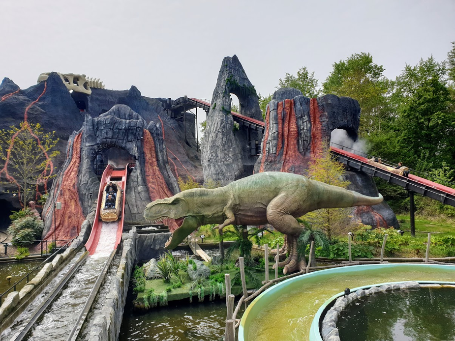 Plops also went completely bananas when it came to theming their log flume. This thing is certifiably insane. Not only does it feature enormous dinosaur statues – some of which spit water at you – but smoke pours from the volcanos and the top of the volcano even features smoking lava and a bit of a light show. Absolute top-tier stuff. The water was proper grim though.