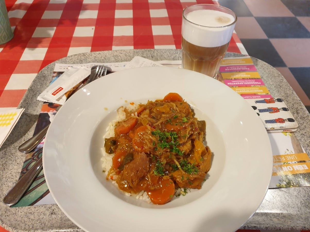 From a vegetarian perspective, I’d heard from friends who had visited the park a week or so before us that meat-free options were hard to come by. After scouring the park, we found one location that sold a veggie burger (but was closed) and then Mr Spaghetti in the main square. Mr Spaghetti offered large meals on actual plates which made the pricing feel less egregious. Here I ordered the ‘vegetarische wok’ at 15.99€ along with a latte for 3.75€. I wouldn’t usually have a hot drink with lunch, but it was a bit cheaper than a diet coke. To their credit, the latte was very nice, albeit served in a glass so it burned my hands? Sadly, I cannot say the same for the vegetarische wok. You know that taste that canned food always seems to have? It tasted very much like that. The carrots were of the soggy school dinner variety and the meal also featured what I very much hope was fake meat. It was very life-like which led me to ask at the counter whether it was truly vegetarian, where I was assured it was tofu. It was clearly not, but I’ll just put that down to a language barrier. Next time I’m just getting a waffle.