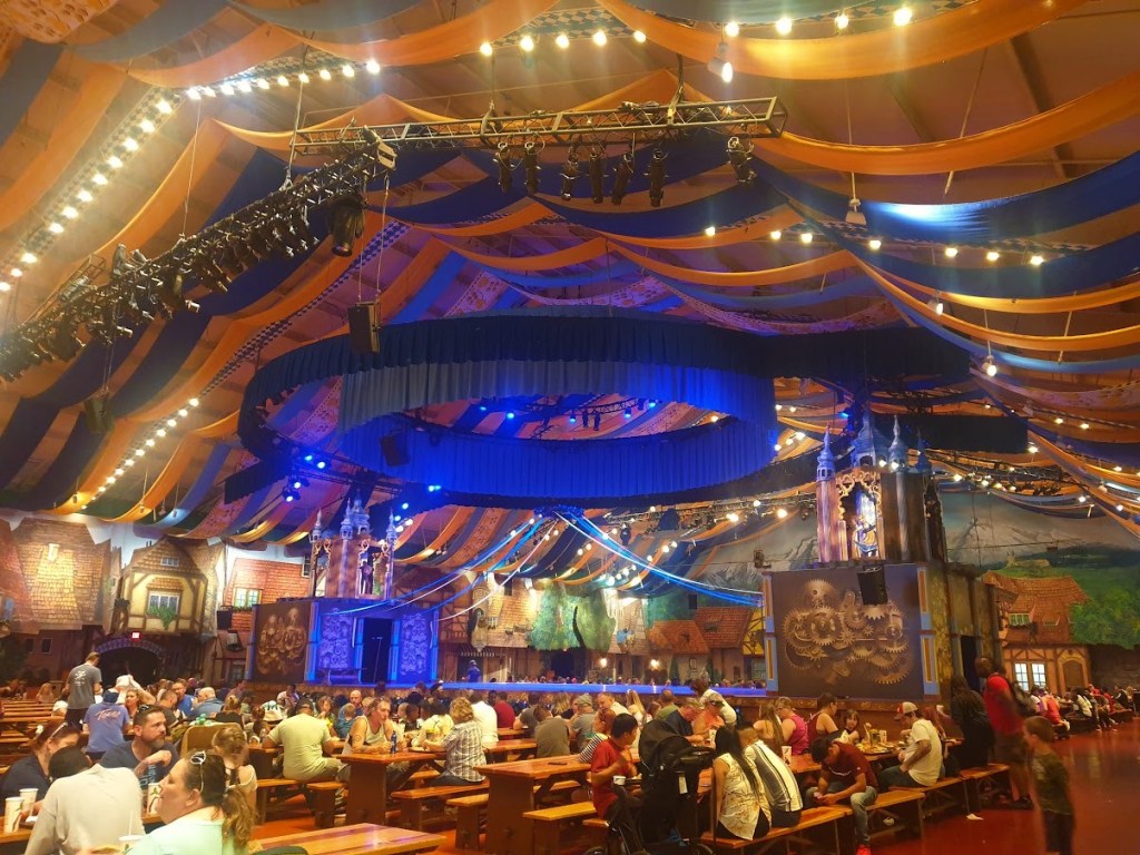 After spending a not-insignificant amount of time in Pantheon’s sometimes-shaded queue line, it was time to rest and refresh. Thank god for Das Festhaus! Located in Oktoberfest, Das Festhaus is an enormous, air-conditioned hall featuring shops, a food court and a stage large enough for impressive entertainment – this is the sort of thing every theme park should offer! Here you were able to just wander up and grab a cup full of ice water, before sitting and resting until the entertainment began. We were lucky enough to catch the entirety of OktoberZest, their traditional German dance show and I absolutely loved it. It was such a weird, weird show. At times it featured men slamming axes into logs, in time to music. We assumed these were props, but there were wood chips flying everywhere so who knows!? Either way, during a long theme park day, these opportunities to take a moment to breathe are worth their weight in gold. Thanks BGW!