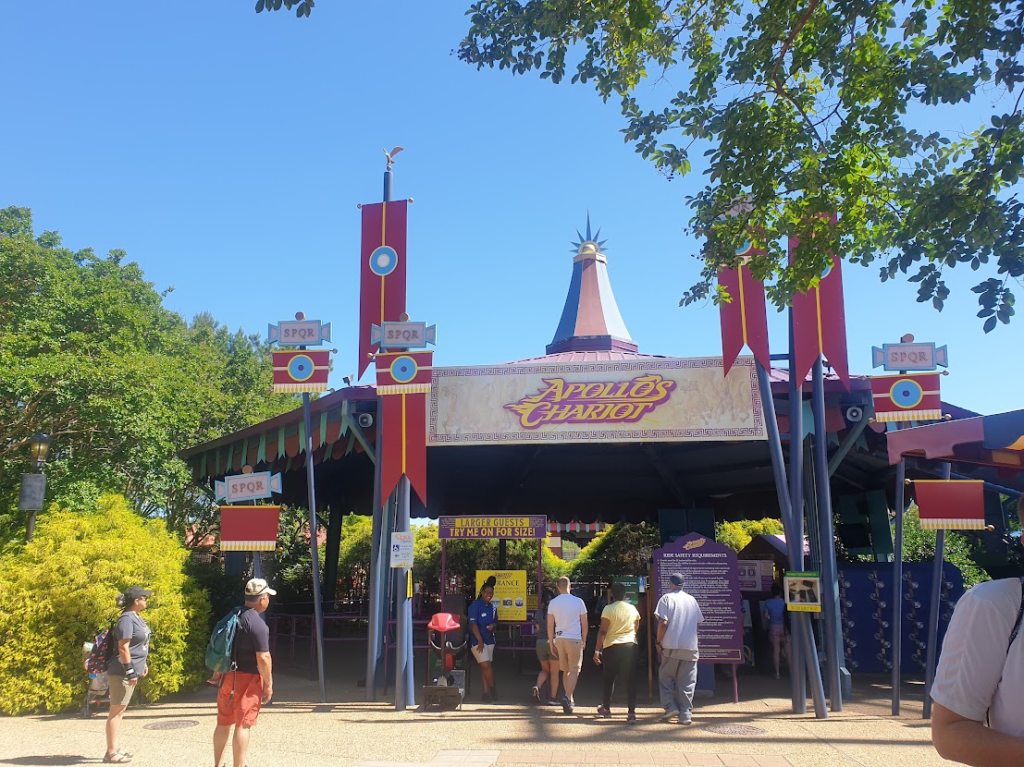 Of course, the main draw here for us was Pantheon, the aforementioned newly opened Intamin multi-launch. Like any coaster fans, we started the day with an attempted rope drop. However, when we got to the ride there was already a line snaking from the ride sign, all the way back to the land’s entrance. Before committing to the wait, we scooted down to the staff member outside the entrance who broke the news that the ride was down and we’d be best off trying something else. (They weren’t wrong either, the line was still there 2 hours later!) So, try something else we did, walking across the plaza toward Apollo’s Chariot. Before we could join the line, it was time to purchase our locker rental. At $10 for the whole day for a transportable locker, it didn’t seem like an awful deal. Until we were charged $20. Despite all signage, and even the kiosk stating $10, we all compared bank statements and were each down twenty bucks. I’d actually forgotten it until now, but that sure made for a sour start to the day! At least it’s hard to stay mad when you’ve got a ride like Apollo’s Chariot waiting for you. I didn’t know anything about this before I was in line, but it turned out to be my first ever B&M hyper – awesome! God, I loved this ride. Over the day I managed to ride three times and each one was thrilling, packed with both floater and ejector airtime and smooth as butter, but my final sunset front-row ride was something very special. It was the first time on the trip I’d felt that kind of speed, but it certainly wouldn’t be the last.