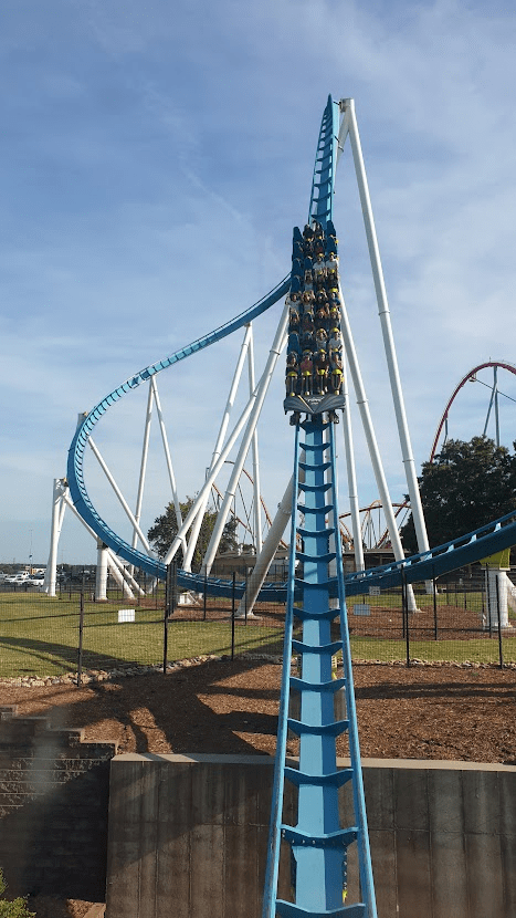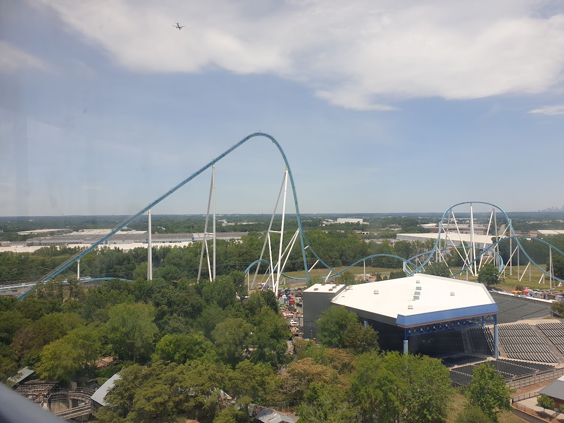 With a five-hour journey between Kings Dominion and Carowinds, we booked a motel a little north of Charlotte, giving us just an hour’s drive in the morning through North Carolina’s beautiful, most-populous city. We still had a good ten minutes left of this drive when we first saw it. The jaw-dropping scale of the world’s tallest lift hill. Fury 325 towered above everything else in sight, filling the sky with beautiful twists of blue and green.
