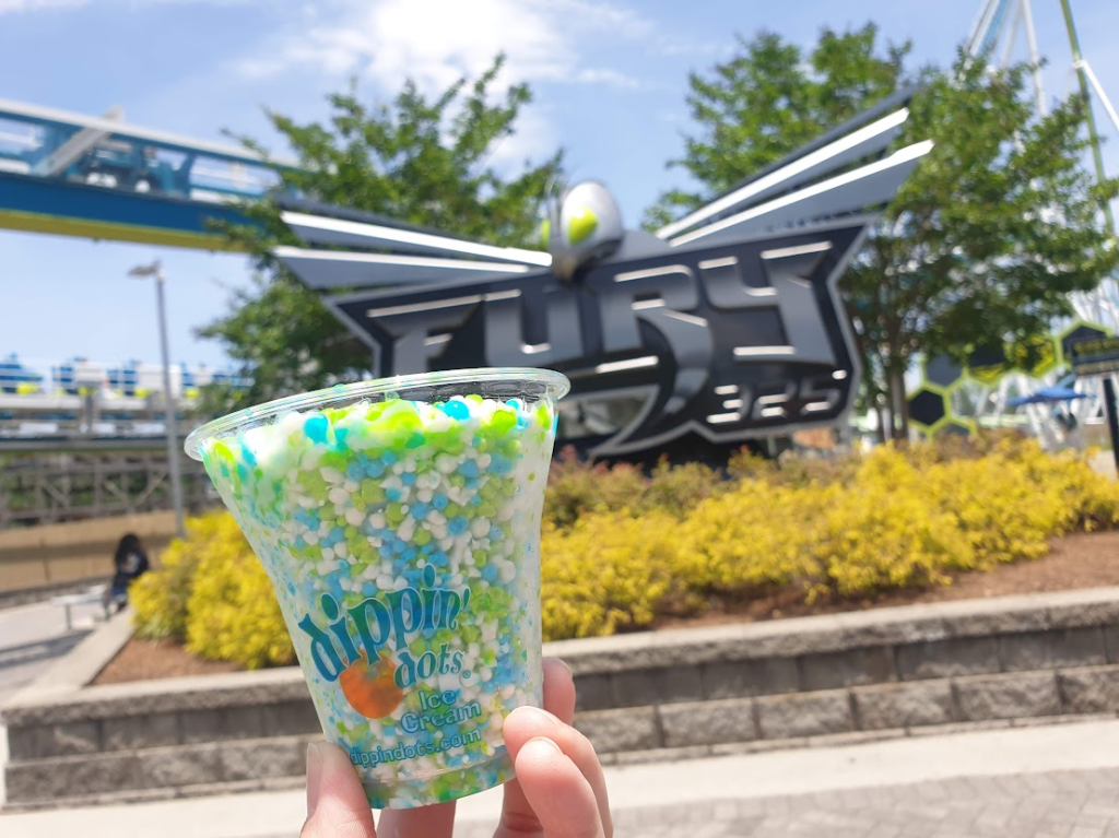 Staying on the subject of food for a moment, Carowinds actually offered a themed snack! (!!!) Across the park, you can find their own unique flavour of Dippin’ Dots – Fury Freeze! They tasted a little odd – blue raspberry, lemon and lime? – but were an absolute must purchase. Even if trying to get to Fury for a photo before they all melted in the crazy heat was the most stressful moment of the day – you can just about see the melted ones at the top!