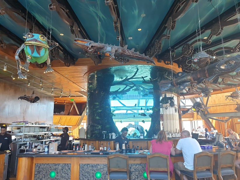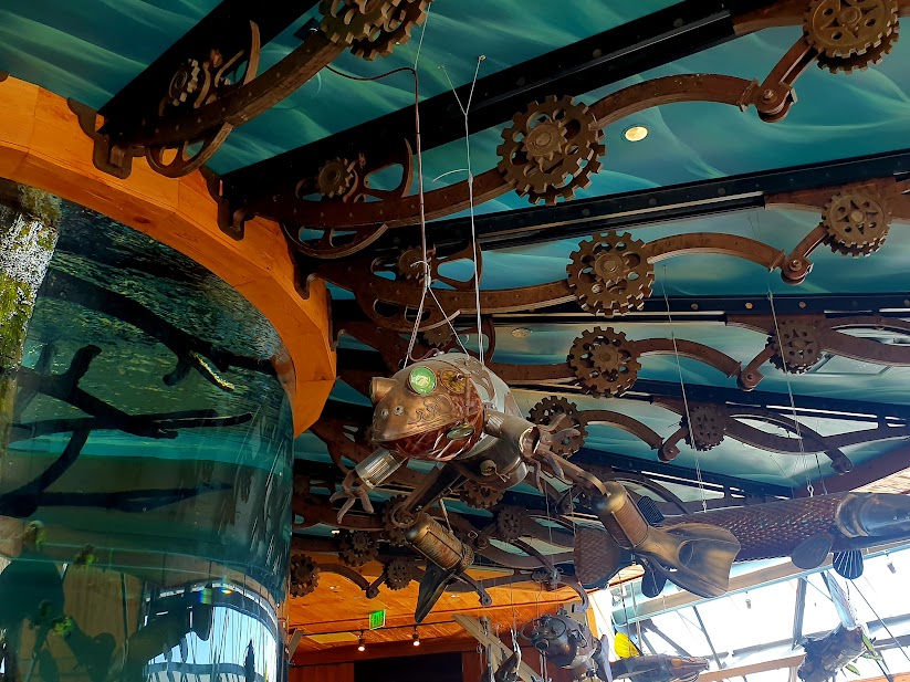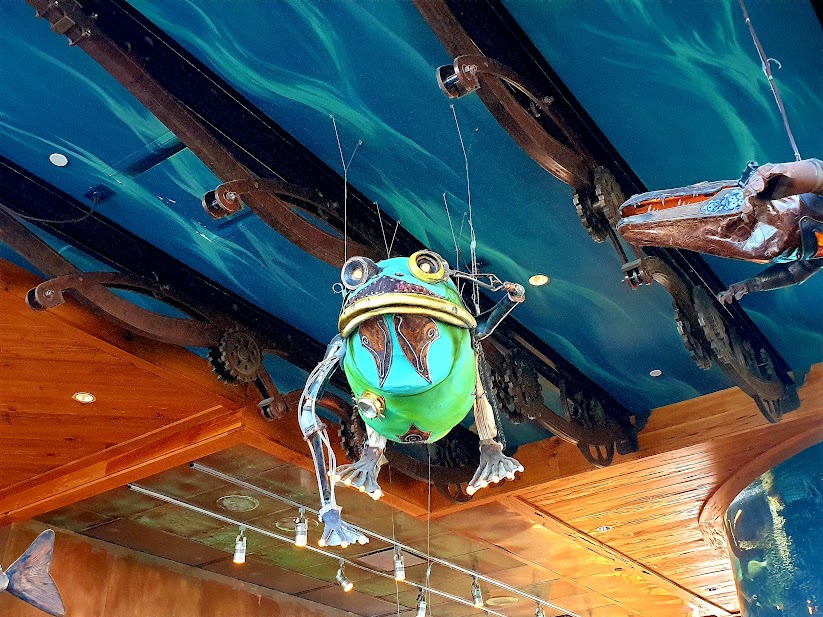Once we reached the summit, we were greeted by yet another surprise: a gorgeous bar surrounding a vast fish tank and filled with steampunk sculptures of aquatic creatures! There was a wide range of sculptures, but my favourites were definitely the multiple frogs – look at these guys!