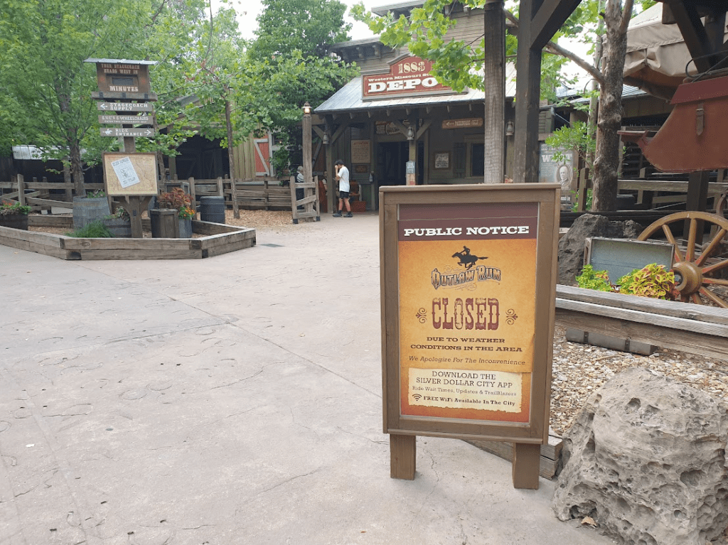 And this is where our day ended somewhat abruptly. Newly refreshed and ready for rides, we were on the walk back to Outlaw Run, ready for as many re-rides as we could stomach before park close. However, when we got there, we were greeted – for the first time in the trip – by a dreaded sandwich board. The ride was closed.
