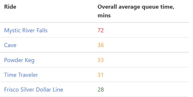 Having done some research about wait times at all of the parks on our trip prior to arriving, we knew there was one ride that absolutely had to be our rope drop go-to. Whilst Silver Dollar City is known for handling a crowd very well – even on it’s busiest days long waits are very rare – there was one ride that was known for getting completely slammed. Unsurprisingly, this is the newest ride at the park: the new for 2020 Mystic River Falls. Just look at these stats from the always wonderful queue-times.com!