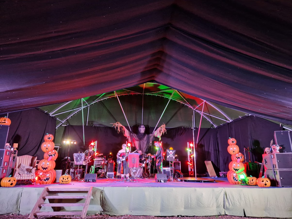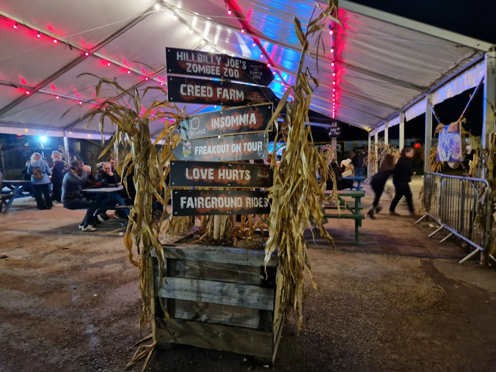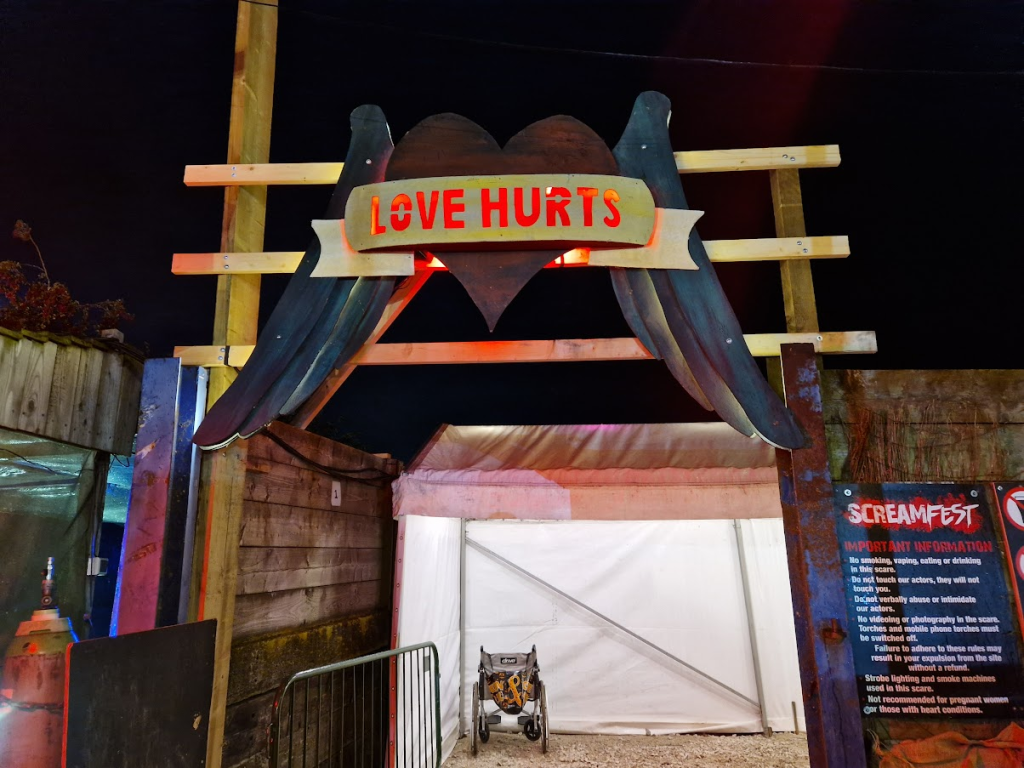 After that ordeal my throat was entirely dried out from screams, making it the perfect time to grab a drink and check out some of the entertainment on offer. The rain was coming thick and fast at this point, so the sheltered music stage felt like absolute heaven – and to be fair it probably would have in good weather too! The band were actually very good, playing a few covers including a gorgeous version of Creep. All the while scare actors roamed the stage and the crowd, providing laughs and scares in equal measure. I could very easily have spent a decent amount of time relaxing here with friends and just soaking up those autumnal vibes. But we had scares to experience so onward we marched, to our final – and probably most anticipated – scare maze: Love Hurts.