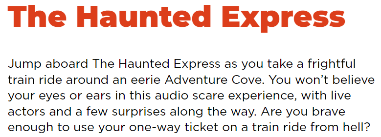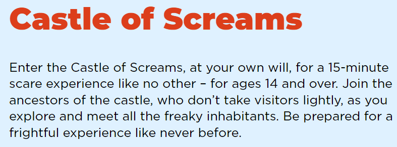 This event was (and still is) listed as including the following spooky attractions for guests aged 14 years and over (I would usually summarise these myself but I think it’s important in this case to see what is being advertised by the park):