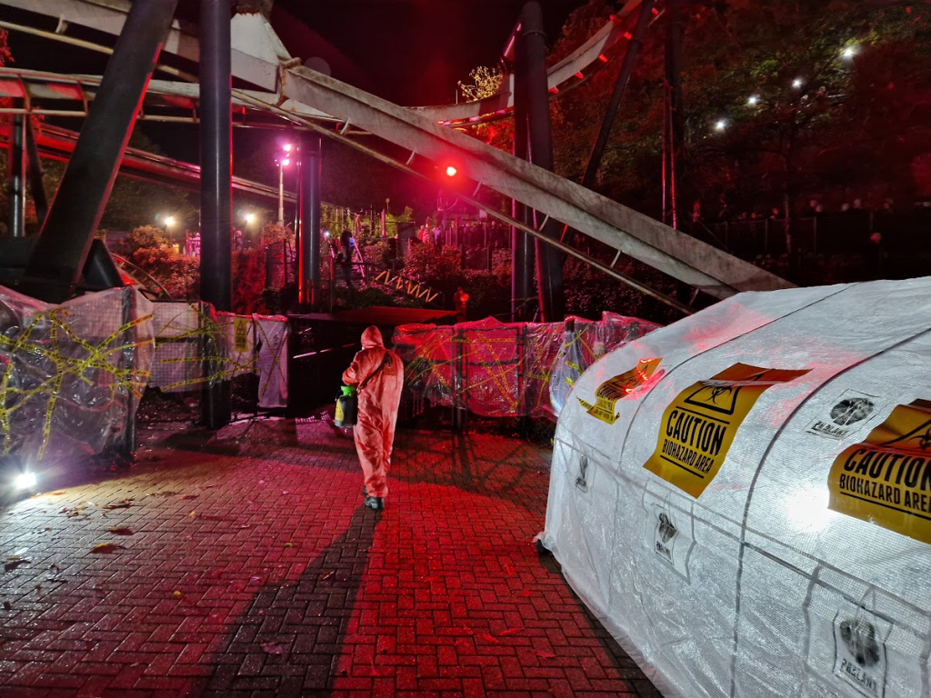 Whilst the crowds were overwhelming – we’re talking Disney park post-fireworks – the atmosphere on the way to the Valley was electric. However, even the incredible announcement video didn’t manage to prepare me for what we were about to find waiting in Forbidden Valley. As well as a queue all the way back to the Duel toilets (!) for final rides (that was expected), the entire area had been transformed (that certainly was not!) Our familiar theme park land had been turned into the site of what seemed for be a forensic investigation. Tents had appeared, and outlets had been covered in protective sheets. Ride closure signs had been covered in new signage from the Phalanx. Most strikingly, the Phalanx themselves had taken over and certainly weren’t afraid to make their presence known. Neither, for that matter, was Nemesis itself. It was roaring. But not just the beloved, iconic B&M roar but an actual screech, like a creature in pain. Whilst normally, such a noise would break my heart, I was almost hyperventilating with joy. I just couldn’t believe this was real. They went to this length. For a retrack?!
