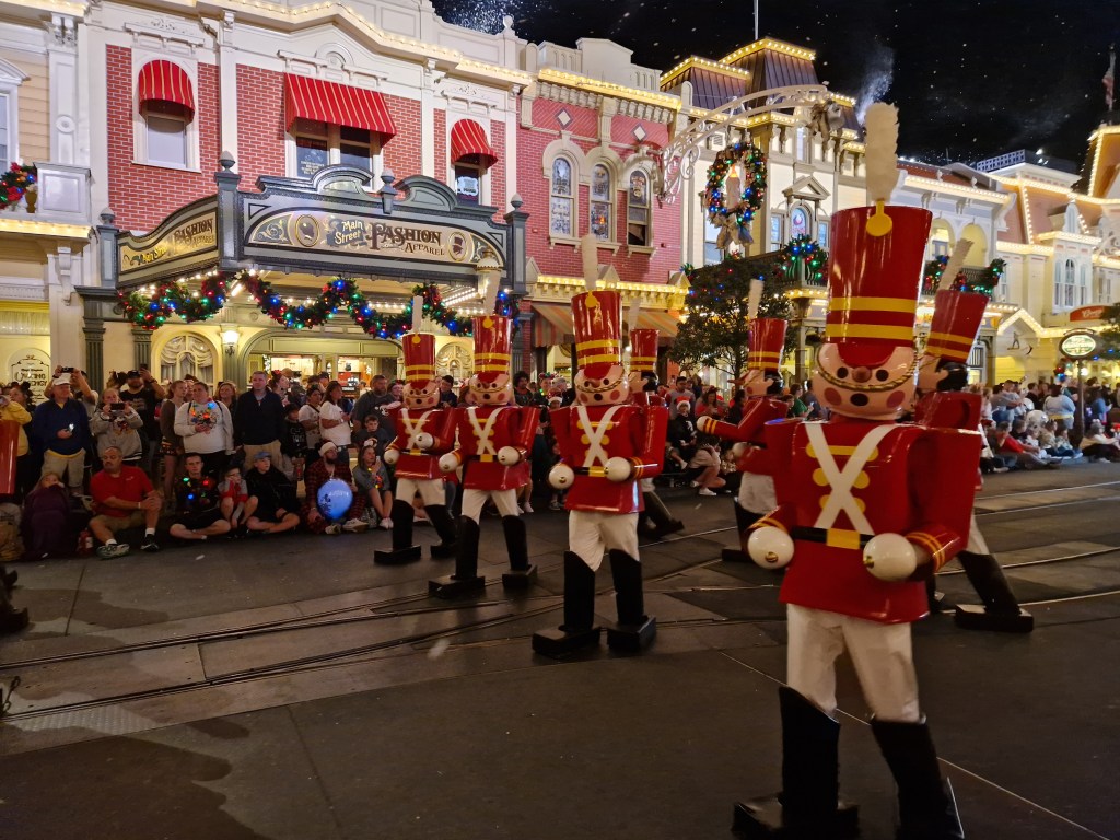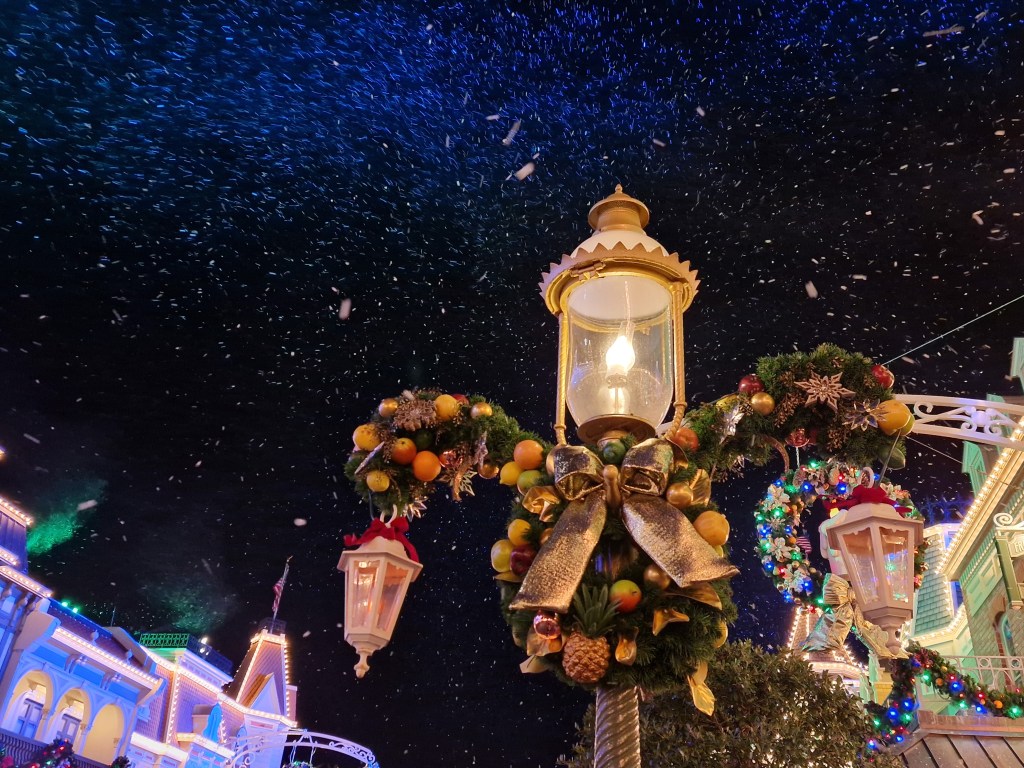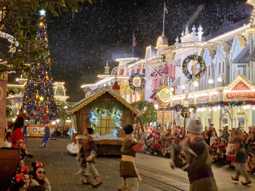As a sucker for a parade – and Christmas – I made sure to catch both performances, watching once from Liberty Square and once from Main Street and I cannot emphasise enough how superior the experience on Main Street was. In fact, watching from Liberty Square almost immediately made me double down on my plan to watch both showings, so lacklustre was the atmosphere. This is definitely due in part to my particular spot, which was directly opposite a floodlight. This light served to suck any joy away from the lighting on the individual floats and just offered a very utilitarian atmosphere, even with the Rivers of America flowing behind. I’d been hunting for a spot when a kind, elderly Floridian couple offered me a space next to them in ‘the highly coveted spot we grab every year’. Someone should really tell them… Anyway, not only is the lighting on Main Street far superior – I mean, nothing can beat that Main Street glow -but throughout the entire parade the air swirled with snow. Well, snoap. Friends, as beautiful as it is, if you have sensitive eyes or skin this may not be the spot for you. There is a LOT of snoap. On top of all this, Main Street also featured a roaming entertainment/hype team building anticipation prior to the show and a photopass photographer taking photos by request.