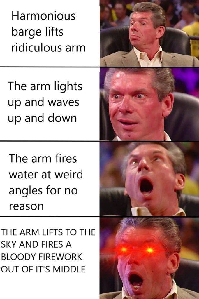 But that’s not why I love it. Okay, it is a bit, but whilst the music makes my heart soar, the part of Harmonious that made me laugh in disbelief and wonder at what I was watching was, legitimately, the barges. They are simply so monstrous, so ridiculous, that I was captivated. The Walt Disney Company actually paid who only knows how much money (Does anyone know?! I couldn’t find this information!) just so I could stand here and watch a battle-sized flotilla raise their stupid octopus arms into the air and light up, spray water at seemingly random tangential angles or point up to the sky before activating their FIREWORK GUNS.