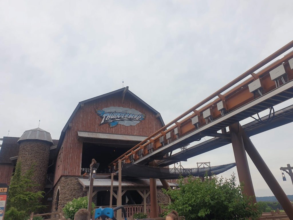 Practically overflowing with Mountain Dew, we ventured deeper into Thanksgiving, heading towards a ride that stands in stark contrast with the rest of the offering at Holiday World: Thunderbird. A B&M wing coaster, but a B&M wing coaster featuring not just the only launch on a B&M wing, but the only house-made launch on any B&M coaster in the world. (The Incredible Hulk’s launch was not built by B&M!) It’s a shame too, because Thunderbird’s launch was impressively snappy, perhaps feeling even more so from the comparatively exposed wing seats. Aside from the launch, however, the ride experience wasn’t super memorable for me. There were moments I adored, particularly the final in-line twist, which offers a fantastic head-chopper element through a barn before progressing through slow, graceful hangtime – the best finale – but what truly makes this coaster is its surroundings. Swooping through the woods on the glossy smooth ride, you really do feel like you’re flying, and the views of The Voyage are some of the best – read: the only – in the park. Thunderbird definitely benefits from its launch – it’s super fun after all – but it still doesn’t manage to top that slow initial dive drop on The Swarm for me. A rare UK W.