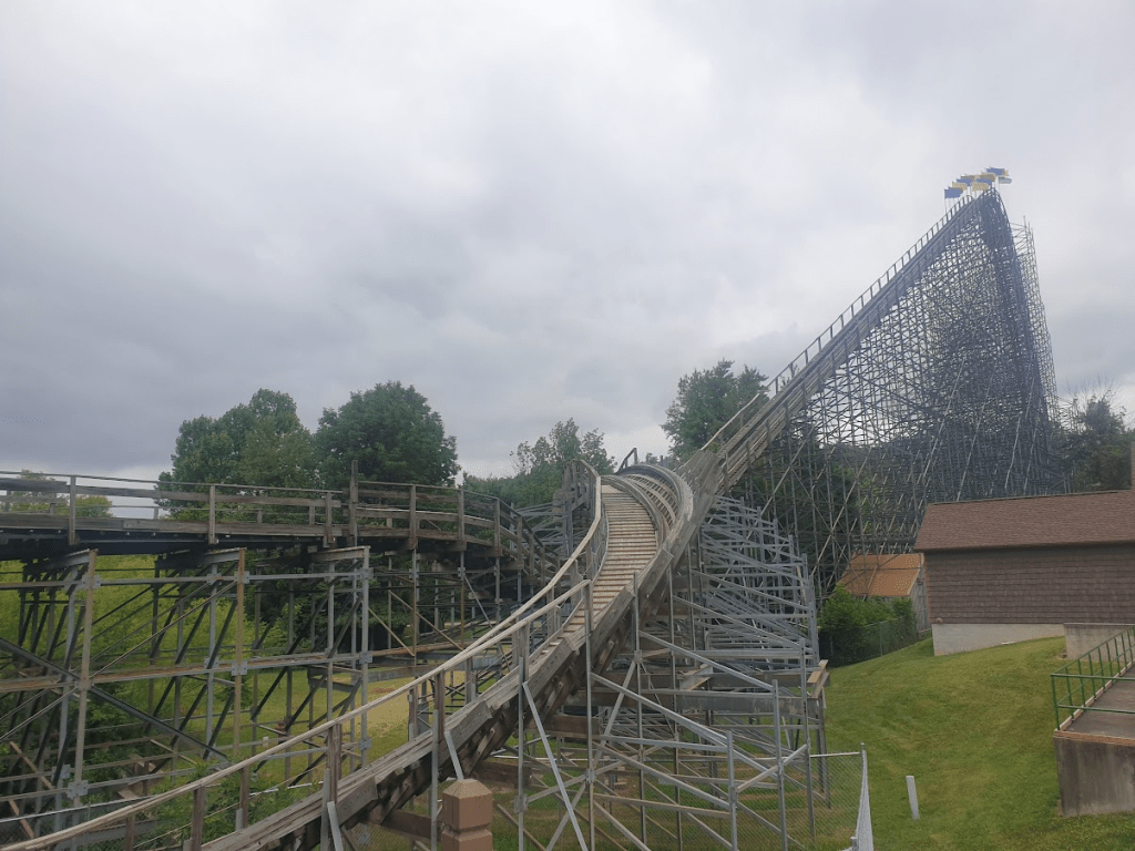 In fact, even now I’m not quite sure what on earth happened on this ride. (This is going to be a great blog post isn’t it?) Except that it was nothing like I had ever experienced before. For the most part throughout the trip, I’d been giving wooden coasters (outside of those manufactured by GCI and RMC) a miss. It’s not that I’m particularly averse to a classic woodie, it’s just that I knew I had to try and get myself through this trip and being pretty sensitive to a rough ride, this felt like the right call. So having avoided much of the USA’s wooden coaster offering, and with no woodies you’d really call big back in the UK, The Voyage hit me like a truck. It was magnificent. When talking about coasters there are a few phrases that get bandied around a lot, including ‘I was practically stood up!’ and ‘I was out of my seat more than I was in it!’ Never had I felt either of these statements more relevant than they did immediately after riding The Voyage. It’s practically a stand-up coaster for crying out loud. And it is long. So, so, so long. As you dip in and out of tunnels, and through the forest, it feels as though you’ll never make it back to the park, though not for lack of speed. Where other lengthy coasters can lose their momentum midway through (not naming names El Toro), The Voyage never ever ceases to pack a punch. Every time you think you’re due a rest, it just keeps on hauling. And here my friends is where we hit a snag. This coaster was simply too long for me to truly enjoy. Don’t get me wrong, I adored the first half. Adored it. But it’s not smooth. It’s not rough, not really, but it doesn’t reach GCI levels of smoothness either. And that wouldn’t have been a problem if it had run for about the normal length of a rollercoaster. But it does not. This is the transatlantic Voyage after all, not the channel crossing. You are in this for the long haul. By the time we reached the utterly wild extended tunnel section on the return trip, I was more than ready for the ride to end. By the time I could see the station, I was practically begging. My head was banging. And this is why I only rode The Voyage once. Honestly, I did have a little cry whilst at the park – and I’m getting emotional thinking about it now – knowing that I’d come all this way, probably on a once-in-a-lifetime trip and here I was, in too much pain to ride this iconic rollercoaster a second time. It cut deep. But as tempting as it can be to go wild and ignore your body in this hobby, sometimes you just have to listen, and this was my time. The Voyage is a magnificent rollercoaster, and I like to think that had I not arrived at the park feeling worse for wear I would have managed a few rides on it alongside my friends, but I’m just overjoyed to have had the chance to experience, if not my favourite, then objectively one of the greatest wooden coasters in the world.
