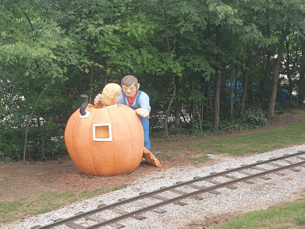 That wasn’t the only ride we ‘treated’ ourselves to down in Holidog’s Funtown of course! We also rode what appeared to be the land’s cute little train ride, Holidog Express, which actually turned out to be more than a little bizarre. What we thought was a traditional transport ride around the park was actually a journey through ‘Mother Goose land’ through seemingly endless bottom-tier fairytales, represented by truly cursed statues and described to us by the train driver as we went along. At least they were for a while, until the ride audio broke down and we ended up just spending the next few minutes gazing out in silence at these bizarre statues, allegedly of scenes from fairytales, but often seemingly just depicting novel means of assault. The was enough of Holidog’s ‘fun’ town for me!