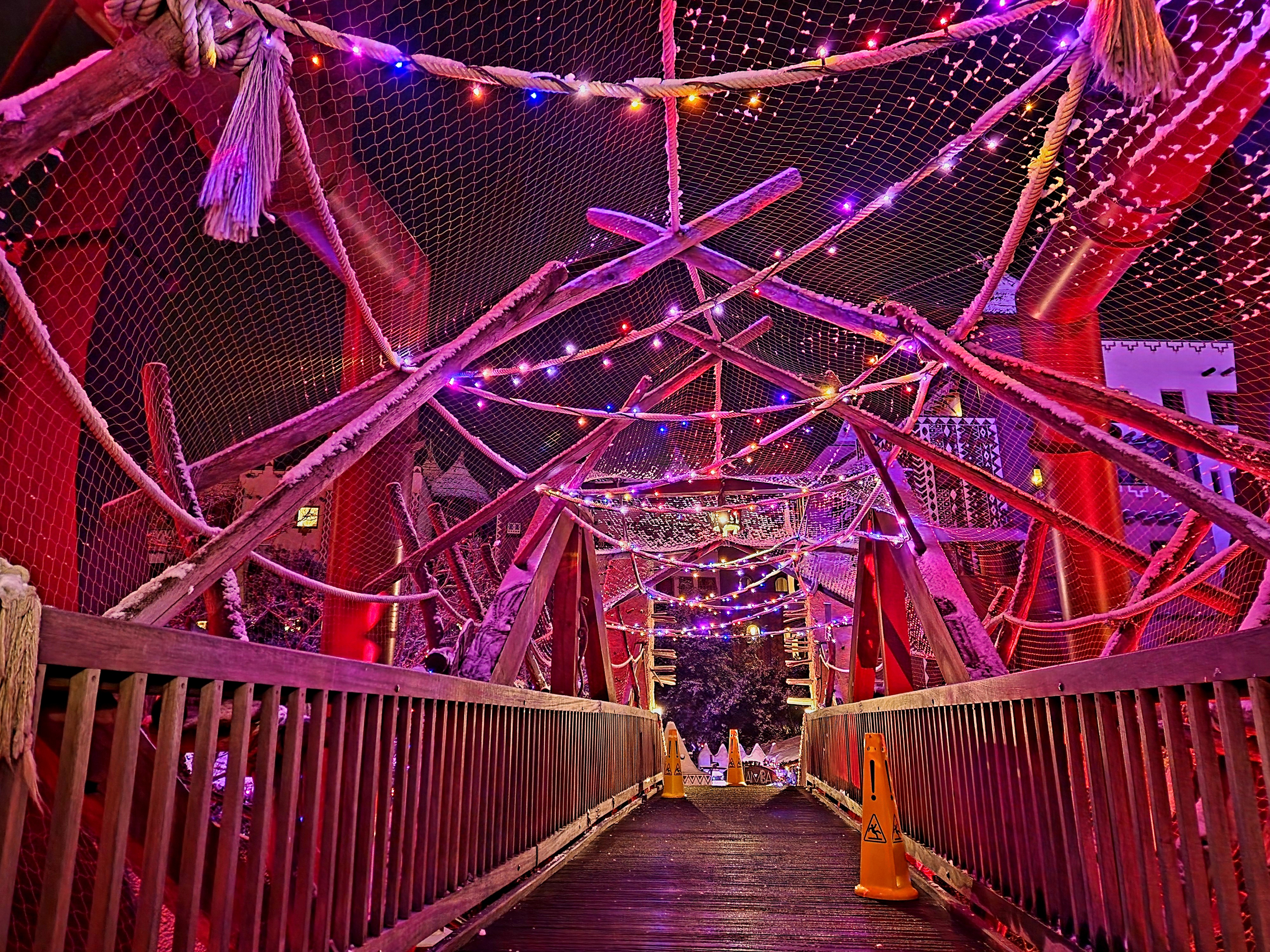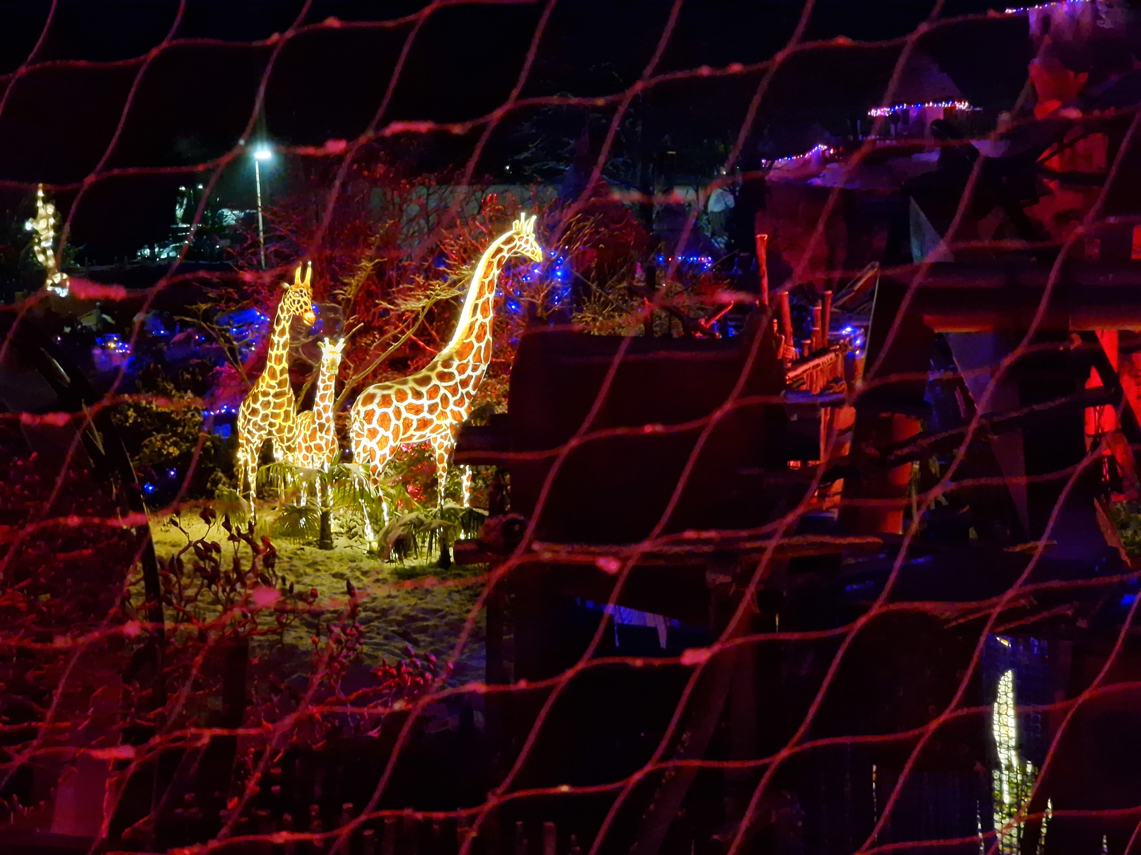 Dramatic hues of red and pink illuminate Africa, with the Black Mamba bridge being a highlight. It’s festooned in gorgeous colourful fairy lights, which made crossing the iconic bridge feel like stepping in to a magical portal – especially when you can just about spy giant illuminated animal shaped in the distance!
