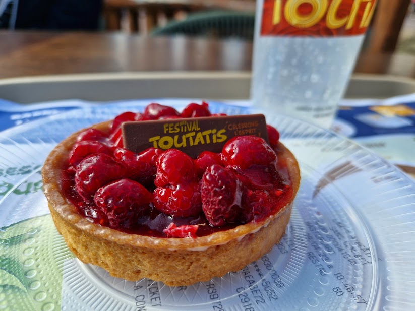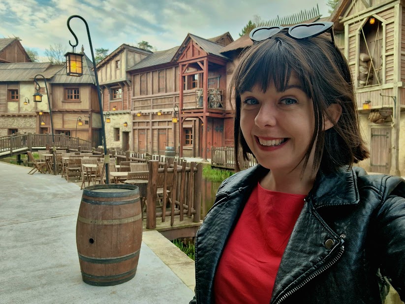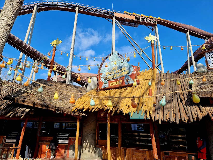 We skipped the NebulaZ on this visit – glorious rides, but they’re such a faff to load that I never ride on a busy day – but loved its positioning overlooking the rest of the land – I bet it offers spectacular views from the top! It’ll come as no surprise that we also didn’t spend a lot of time in and around the children’s play area either, however we certainly did make very good use of the new quick service restaurant, Au Dolmen Gourmand. After our first ride, we headed here to regroup, share thoughts, and – most importantly – try out some of the, you guessed it, themed snacks! Admittedly, I’d only go as far as calling one of the snacks truly themed, but there were plenty of delicious tarts and pastries all bearing a ‘Festival Toutatis’ topper – themed, right? I opted for the raspberry tart, which was delicious with ripe and tasty fruit and buttery pastry, whilst my friends grabbed the dessert, which we believe to be themed to a potion present in the gift shop! This was mousse-based and very much not vegetarian, but super cute. We also grabbed some soft drinks, opting to pay the additional euro for a re-usable cup with Festival Toutatis branding. The restaurant itself has a seemingly endless amount of seating, spread across different levels, which was the perfect place to relax and take in the new land.