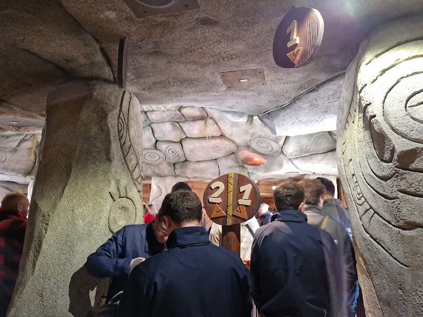 The operations on this coaster were nothing short of spectacular. First, they were operating a baggage system I’ve never seen anywhere before. Guests seat themselves on the ride, holding on to their bags. Then, whilst restraints are lowered and checked, a member of staff pushes a large wagon down the side of the platform, and guests are asked to simply chuck their bag in as it passes by. No faff, no lockers, no money, just efficiency – you love to see it! (Just maybe not so great if you’ve got something super fragile in there.) This was, of course, a factor in the speed of the dispatches they were achieving. If a dispatch took a minute, something had gone very wrong. There was a countdown visible in the station, with a cartoon of the Toutatis statue, whose eyes glowed red should the optimum dispatch time be breached! All of this meant that, despite only operating two trains, the queues were being eaten up. Posted waits topped out at two hours, even getting as low as 45 minutes at lunchtime. On a sold-out opening day, that was really something for the park to be proud of. So, too, was the reliability. From frequent checks of the app, it appeared as though the ride managed to operate solidly until about 5pm, after which it went down a couple of times. With Intamin having a little bit of a reputation, this was above and beyond expectations!