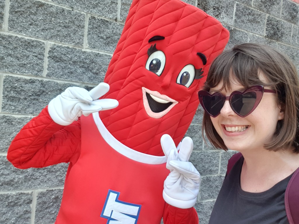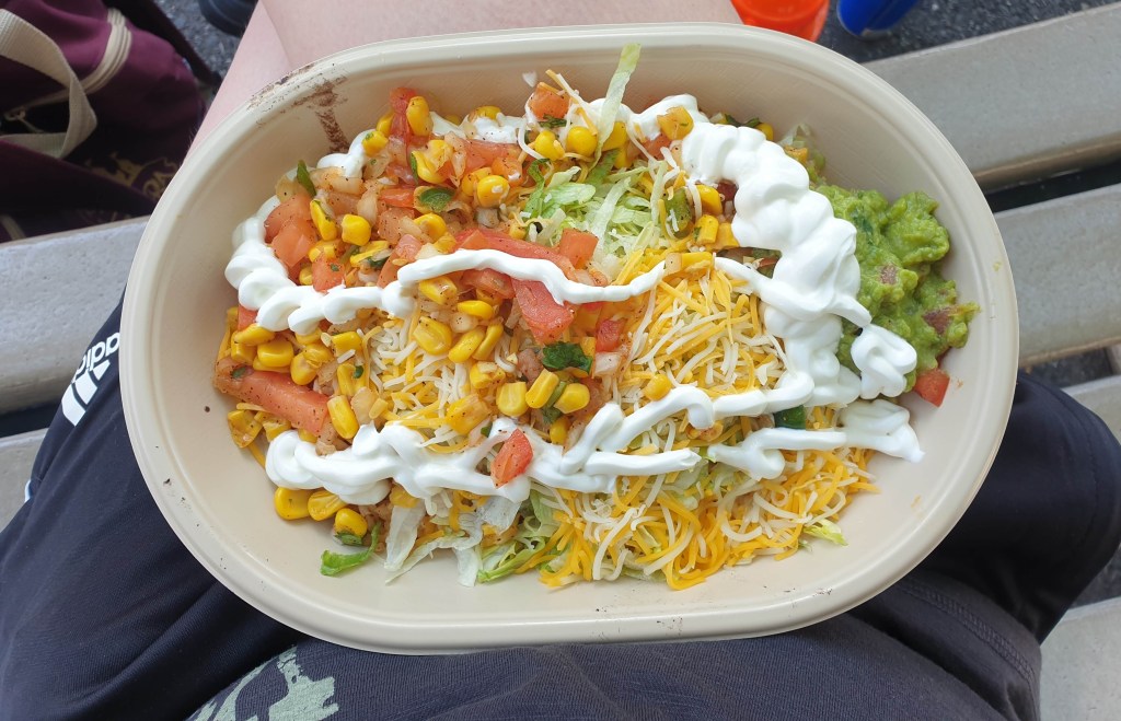 By this point, it was definitely time for some food, and boy, does Hersheypark have food covered. Whilst walking around the park, I saw a lot of incredible looking snacks and set my heart on getting a Reeses peanut butter cup funnel cake. Sadly, when I came to get food, it was so hot that I just could not face any sort of heavy food, ruling out pretty much all of the park’s unique sweet offerings. I ended up splitting up from the rest of the group on a mission to find a decent, light vegetarian offering and settled on Moe’s Southwest Grill, a Mexican chain restaurant with a branch in the park which offered a veggie burrito bowl. This was delicious and felt far more nutritious and fresh than almost anything else I’d managed to obtain in a theme park on this trip. The only issue I had was that the menu listed the protein options as chicken, beef, tofu, or veggie. Tofu can be very hit or miss, so I opted for veggies, but when it was time to choose my toppings, it turned out that they didn’t actually offer vegetables. ‘Veggie’ just meant no main item. They did heap on the sweetcorn salsa, though, so I guess that counts.