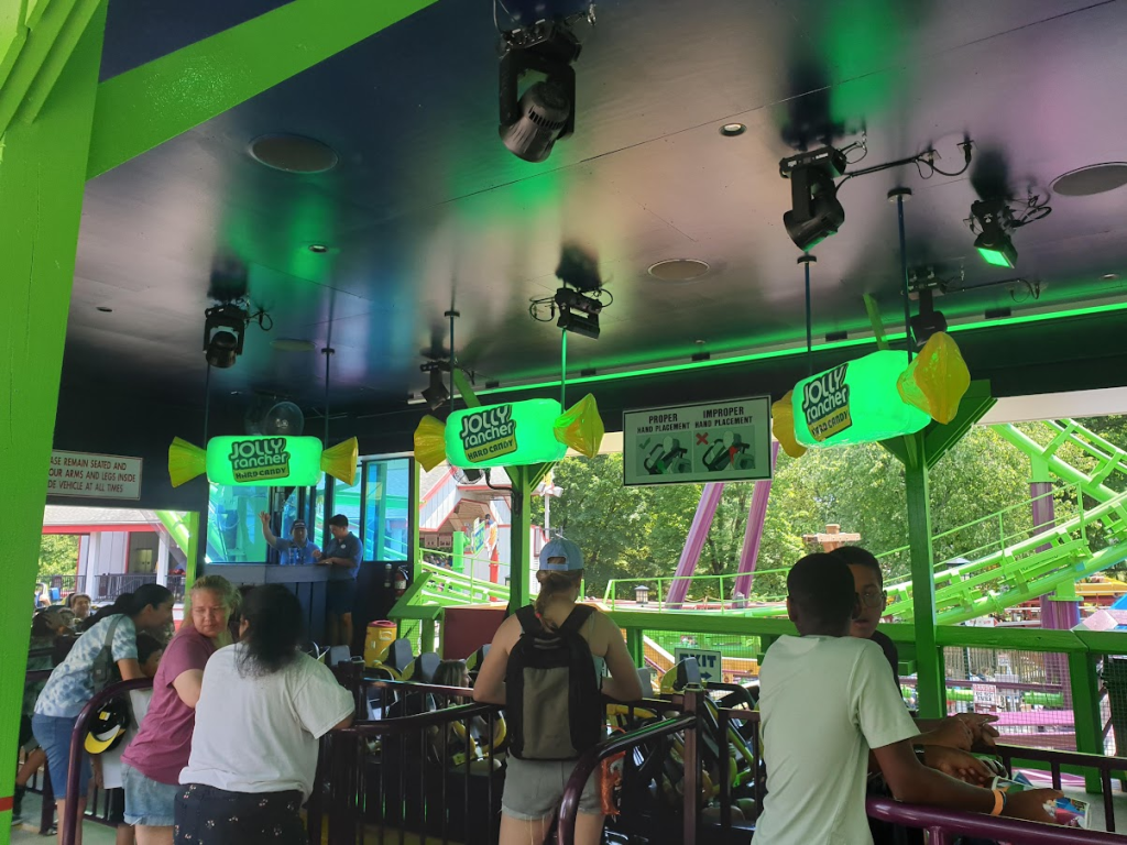 Just across the way from Storm Runner sits the only Vekoma Boomerang that I have actively looked forward to: Jolly Rancher Remix. Before its reinvention, this would doubtless have been an attraction that would have found me checking both the wait time and restraints, only riding if both were favourable – no rock-hard over-the-shoulder restraints, please! However, as of 2022, the ride now boasts an effects tunnel featuring the smell of five different flavours of Jolly Rancher. Or so they say. It all started off so well, with a very dramatic ‘flavour selection process. On entering the station, a series of Jolly Rancher-shaped lights suspended from the ceiling rotated through the colours of each Jolly Rancher before fixing on one, and declaring the upcoming ride’s ‘flavour’ to the riders. I absolutely loved this. Together with dancing lights and pumping music, the energy in there was glorious. So, I was pretty excited when I hopped aboard for our ‘green apple’ flavour ride. Music continued to pump out of speakers alongside the lift-hill as we ascended. Then the ride began. It was about as jerky as any other boomerang I’ve ridden (read: not comfy, but not super painful), but that was fine. Soon, we’d be in the flavour tunnel. Suddenly, there it was, the much-hyped tunnel. We were about to be caught up in a cloud of green apples! Except we weren’t. Instead, we were greeted by the absolute atrocious smell of expired theatrical smoke – at least according to James, my ride companion with experience in these things. I just thought it smelt awful, and certainly not anything close to apple. What a disappointment! At least the station rave was fun.