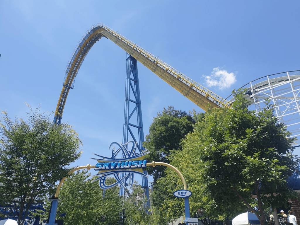 I was dreading Skyrush. After riding Intimidator 305, I learned the hard way that I have limits. That ride was simply too intense for me, and I spent the rest of the trip dreading a similar experience. So, when multiple people told me that Skyrush was the most intense ride they’d experienced, I started to panic a little. I’d also found it difficult to get a definitive answer about what exactly made it intense. Was it whippy? Was it forceful? Was it rough? Who knew? All I knew was that some people adored it, and some absolutely loathed it. Me? I’m firmly in team love! Based on my one ride, it was an absolute delight, and certainly not as intense as I’d expected. Admittedly, I am basing this on the mildest possible ride (I purposely grabbed a mid-train inner seat, did I mention I was nervous?) but the wildest thing was undoubtedly the restraints. Resting about ⅔ of the way up my thighs, they offered a level of freedom far beyond that of normal lap bars, meaning the ridiculous airtime of the first drop felt wild. So wild it felt like it shouldn’t be allowed – and that’s mid-train! The rest of the ride was a solid mix of airtime hills and low-to-the-ground bends, but it ended quickly. Far too quickly, to be honest. I’m fine with coasters being short – I’m from the UK, I have to be – but damn, I just wish this could have gone on a little longer. It could be up there with the best of them if it did. Perhaps for some, the fact that it leaves you wanting more is a good thing. For me, it was just a little frustrating. Either way, there’s no denying that this is a fantastic coaster! I’m just sad I didn’t manage a second ride. Skyrush went down around mid-way through the afternoon and never returned to operation. I just hope that one day I can try a back-row outer seat – I need it!