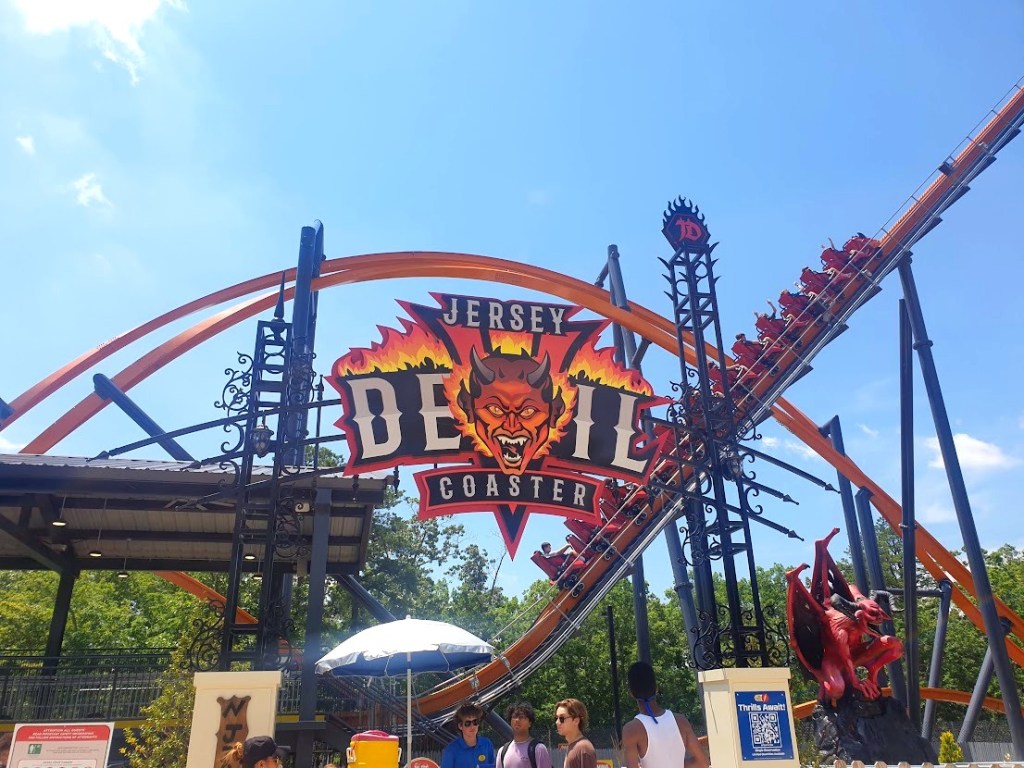 For the last of the must-do coasters, it was time for a hike to the complete opposite end of the park for a meeting with the Jersey Devil. (In one of the few major spites of the trip, Nitro was down all day, so for my own wellbeing I choose to pretend it does not exist.) Jersey Devil is an RMC Raptor single-rail coaster. At the time of riding, it was also the tallest, longest, and fastest single-rail coaster, though those records all now belong to Wonder Woman Flight of Courage at Six Flags Magic Mountain. As only one of five currently operating Raptor tracks, this was one of my most anticipated rides of the trip. For good reason, too, Jersey Devil features three of my favourite coaster elements: a zero-g stall, a zero-g roll, and a dive loop. Each of these felt even wilder than normal, sitting on a silly little seat on your own with your legs at a weird angle at either side. At one point in the ride, I actually lost control of my legs, and they slid out each side, which made me feel ridiculously vulnerable, which only made the experience more fun. On the whole, I loved this. The unique riding position made the whole thing feel like an out-of-control go-kart. The only gripe I have with it is that my ride was rattley, really rattely, although none of my friends had this issue. It was substantial enough, however, that I didn’t end up re-riding, as in the oppressive heat, it was too much for me. One of my friends did notice that the unused seats appeared to bounce around on the track a little, so maybe my seat/section of the train wasn’t weighed down enough to prevent this from occurring? Does anyone know if that’s a thing? I’d love to know for sure!
