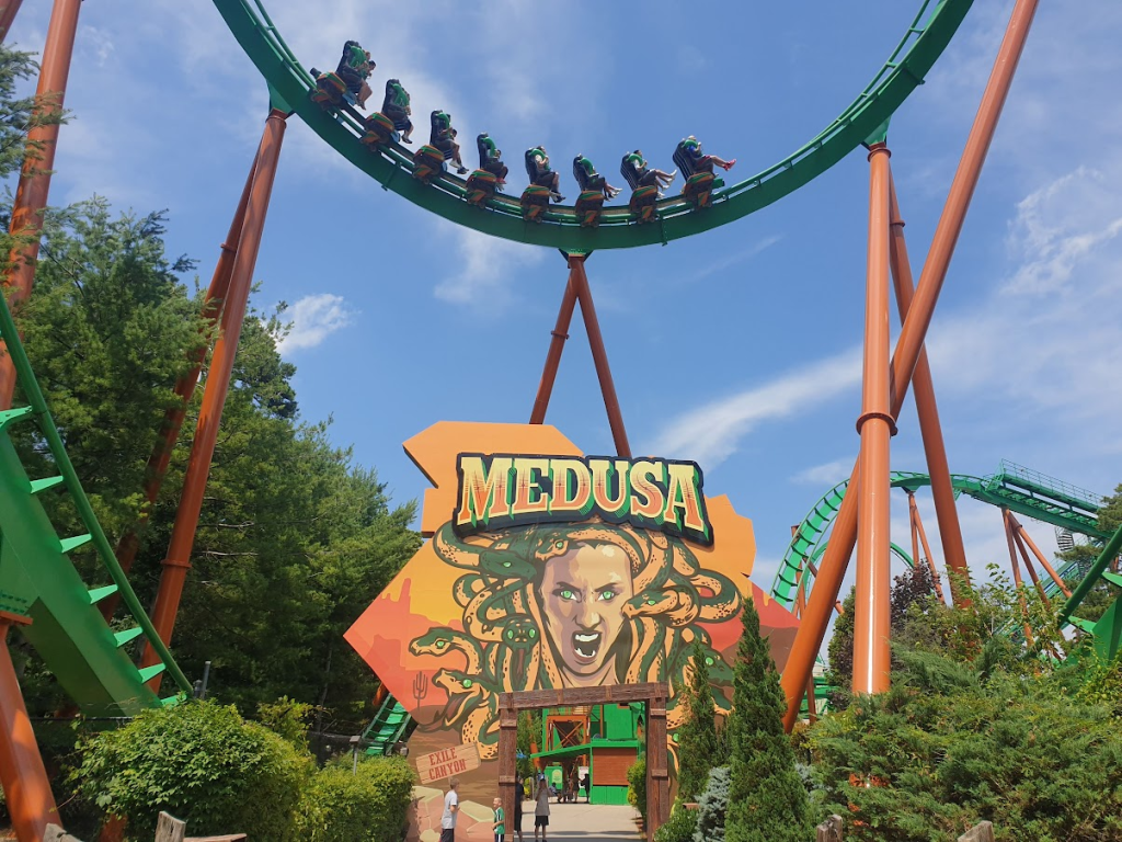 The final major coaster of the day for me was Medusa. On the long, long trek over to the remote corner of the park housing this coaster, I also stopped in at the Runaway Mine Train and Harley Quinn Crazy Train. I’ve got a soft spot for Zierer Tivolis, so Harley Quinn was pretty enjoyable, and my train was full of families having a great time, which made for a fun ride. Runaway Mine Train was yet another fairly unremarkable Arrow mine train, but oh my, does it have stunning views. Positioned next to the park’s central lake, this ride offered some incredible views out over what is undoubtedly the most scenic area of the park.