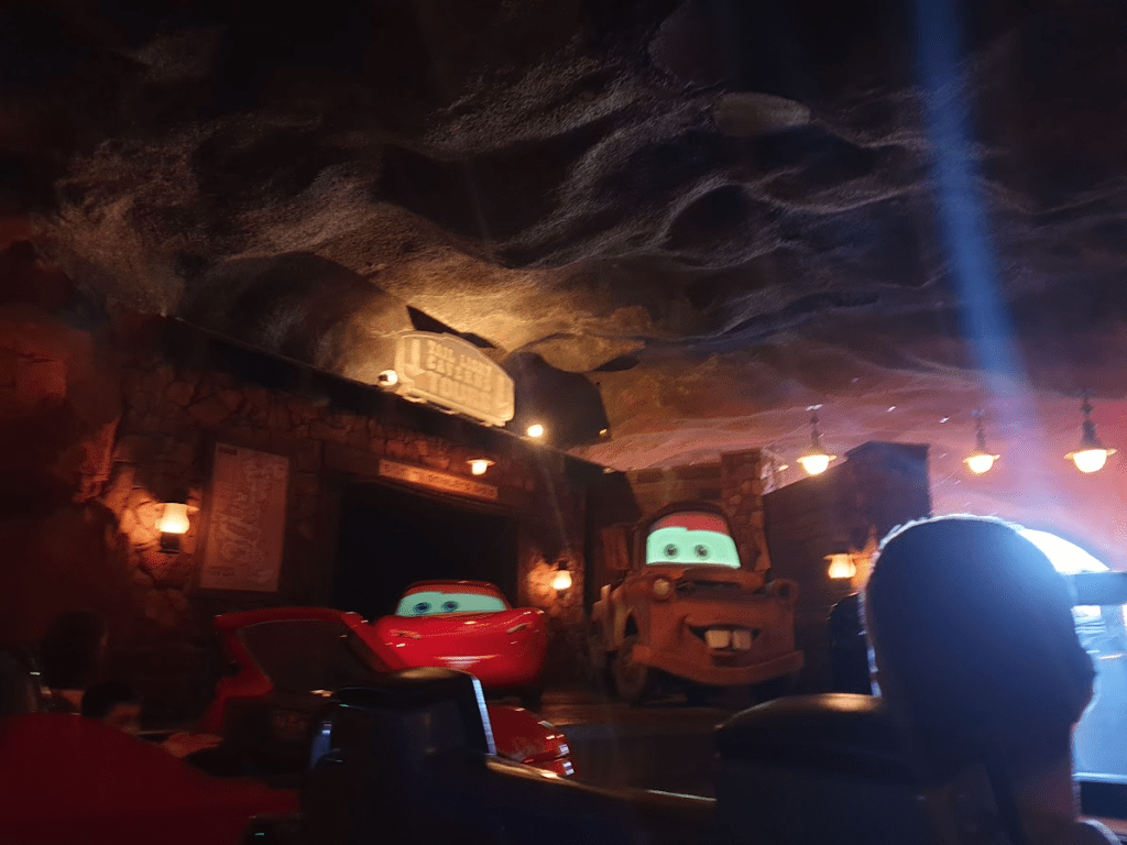 Also, I cannot believe this, but the only photo I have of this beautiful, beautiful attraction is this blurry, glare-filled photo from when we broke down for ages in front of Lightning and Mater. Enjoy!