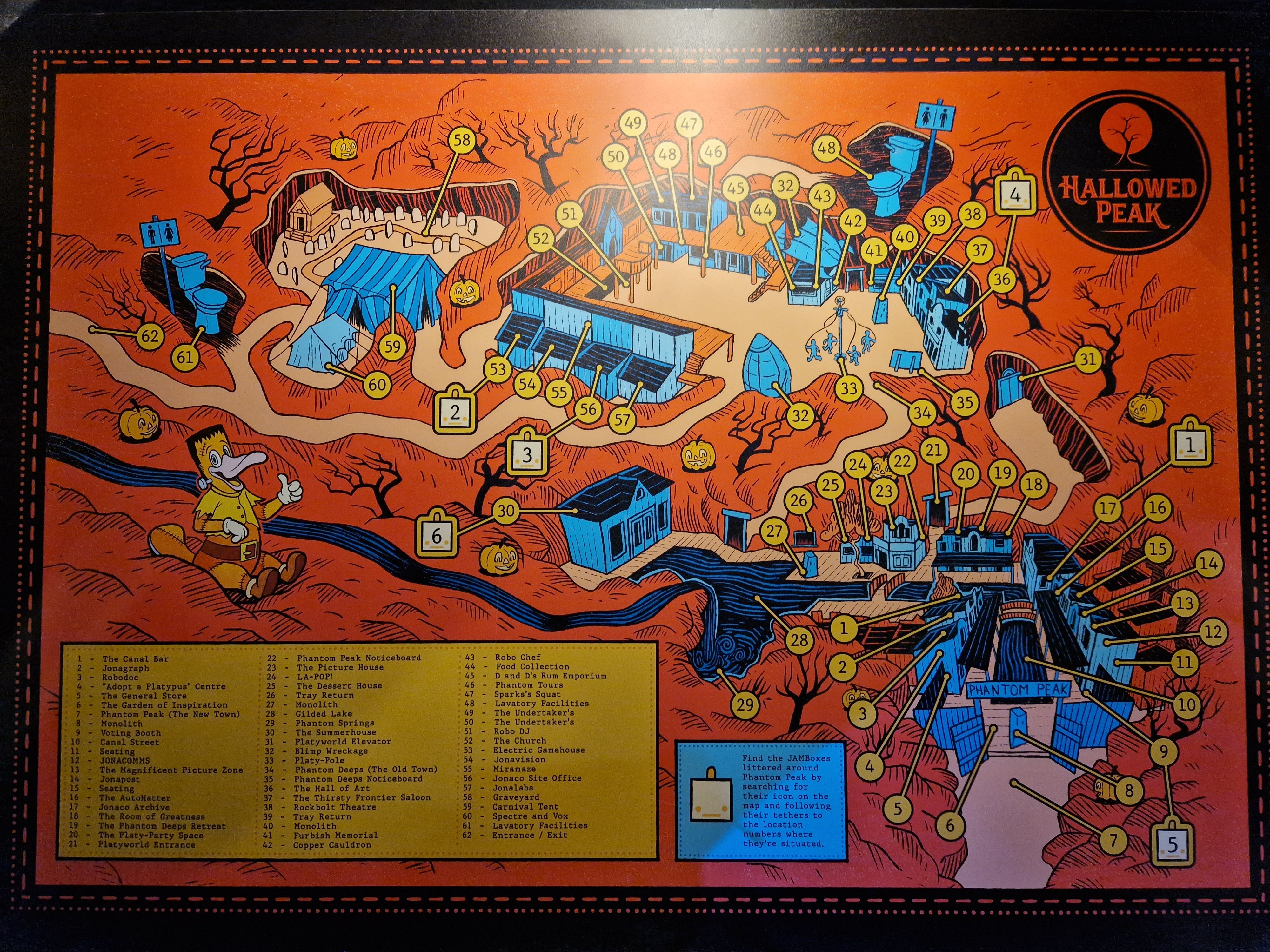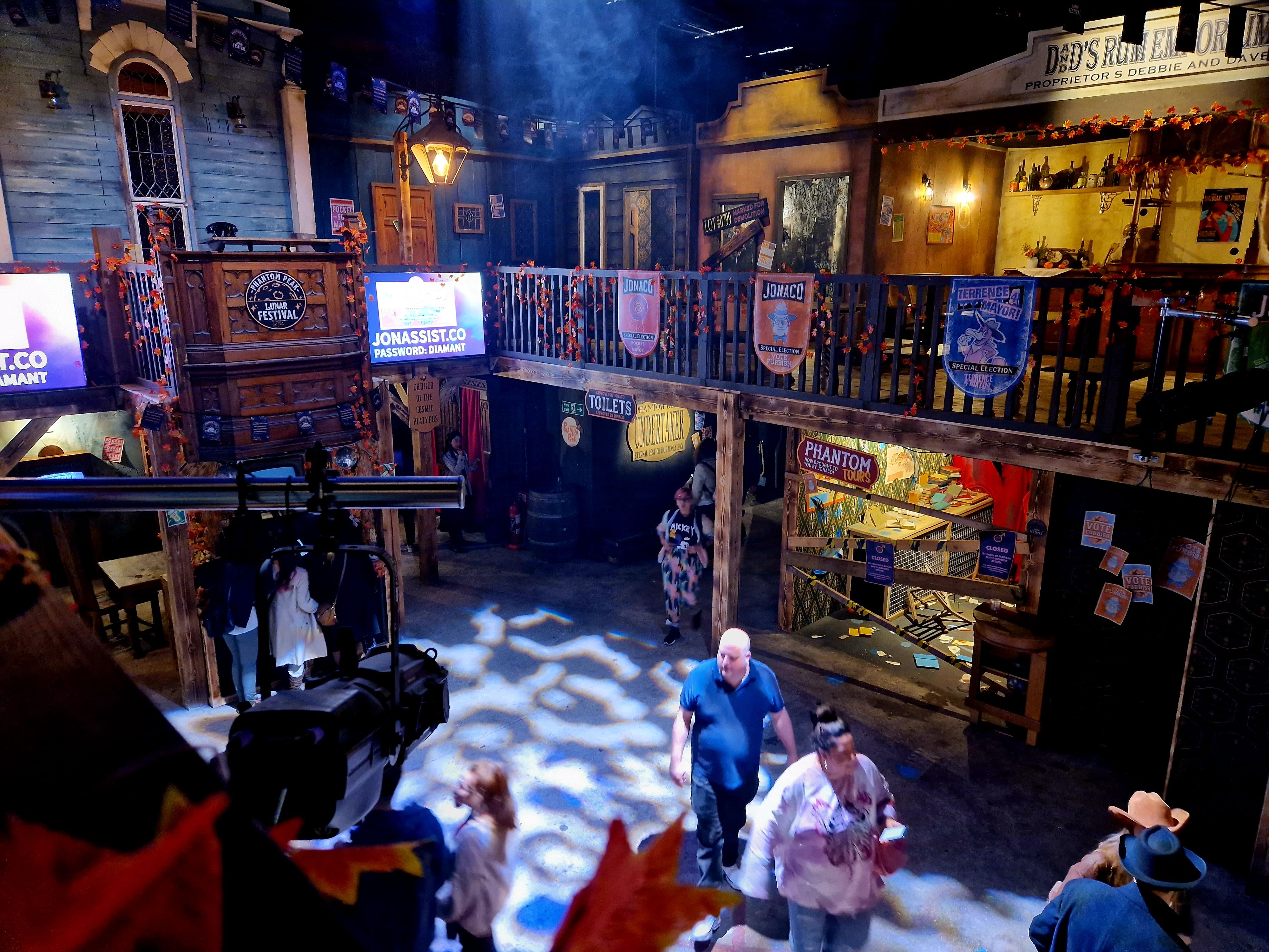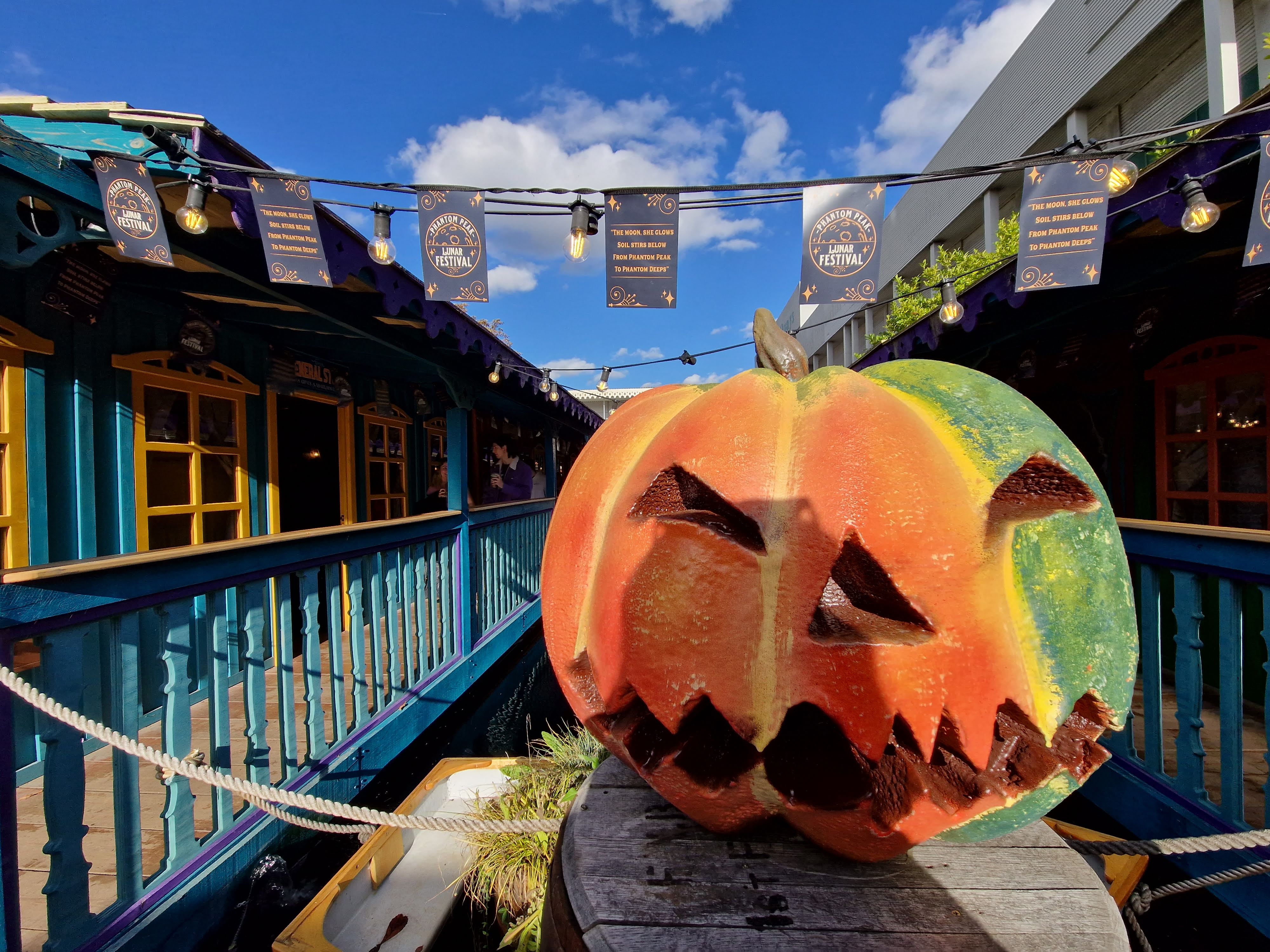 Mission obtained, the next challenge would be to try and orient ourselves in the town of Phantom Peak. Sure, there was a map, but it was stylized enough that before we’d got the lay of the land ourselves, it didn’t seem to help much. As such, we spent a good 20 minutes searching for our first location before having to stop and ask a character for help. After this, though, we had a pretty good sense of where everything was. So, it’s probably worth just taking a good look around to start with anyway! After all, the scale of this attraction is something to behold. I’d seen the outdoor town in the promotional images but had never truly appreciated just how much there is to Phantom Peak. There are so many rooms to explore and so many characters to meet! It’s a gorgeously realised immersive attraction, with fun details, bright colours, and delightfully quirky design – especially if, like any reasonable person, you love a platypus. The Lunar Festival also features an impressively thorough autumnal overlay, with plenty of golden leaves, pumpkins, and skeletons everywhere.