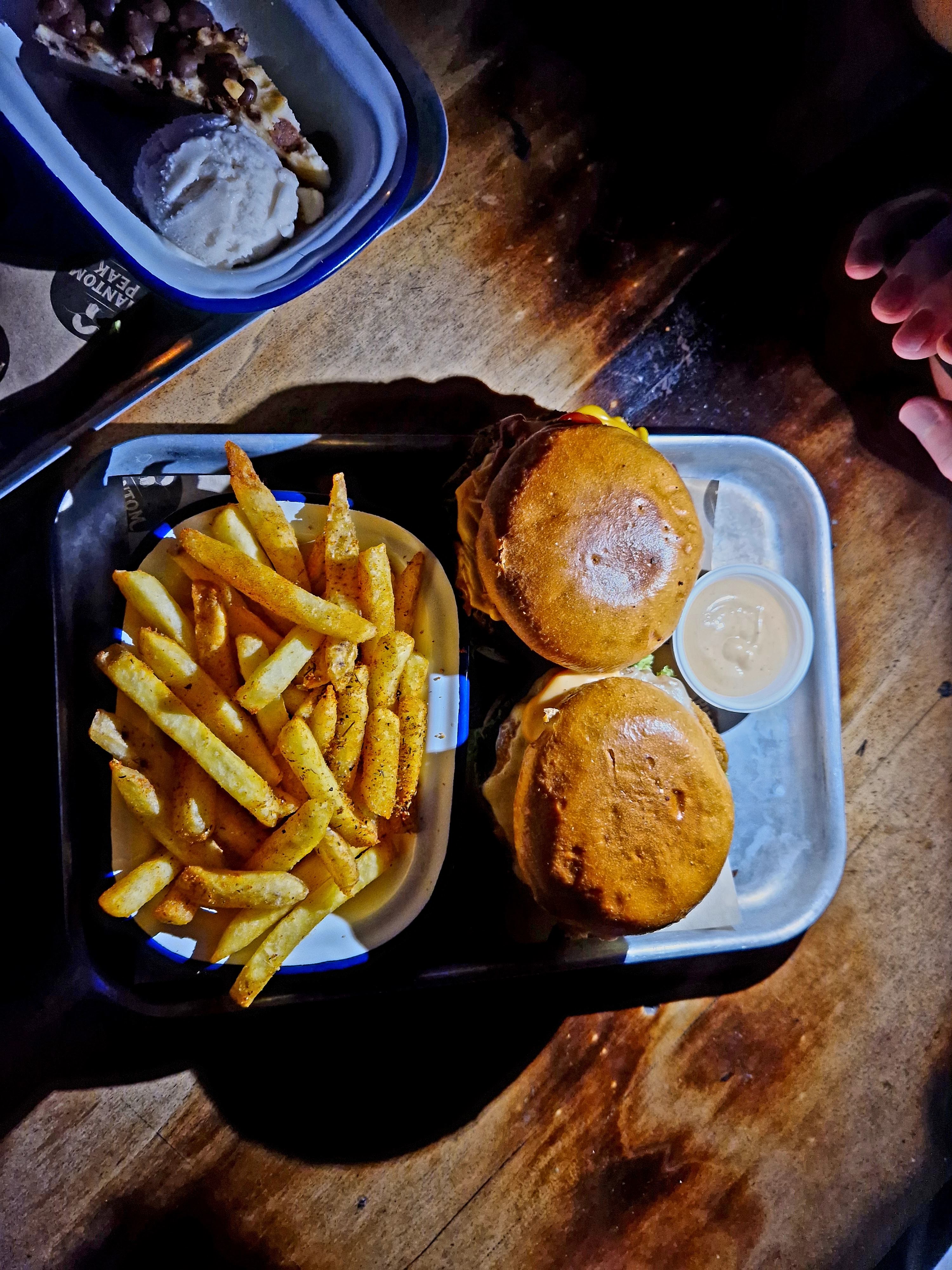 Heading back to food and drink, should you wish to spend your time simply enjoying the town’s atmosphere with a drink and a bite to eat, Phantom Peak offers two bars, a hot chocolate outlet and one quick service restaurant. The bars are reasonably priced (£6.50 a pint, in a themed London attraction?! I’m happy with that!) and offer a great selection of drinks, although I didn’t find any of the cocktails taking my fancy. I did however, try the signature ‘Platypus Brain shot’ – incase you hadn’t figured it out by now, Phantom Peak townsfolk love the platypus – even though it looked absolutely disgusting, and had a list of ingredients I would never dream of including together. Baileys, in a shot with peach schnapps and blue curaco?! Madness. But… it kinda worked? I’m still not sure what the ‘brain’ was made of (pls be vegetarian), but it provided a sufficient barrier between the Baileys and everything else that the creamy drink was able to be drunk separately from everything else. So it was… nice? You’ve always got to try the signature item, right? Food-wise, well, you can probably guess what’s on the menu. Burgers, hot dogs, mac and cheese. Done. Happily, any of the burgers can be ordered as vegetarian, so I opted for ‘The Saviour Burger’ as vegetarian, and we shared a portion of fries between us, alongside a ‘golden nugget’ cheesecake. For two burgers, one portion of fries and one cheesecake slice (no drinks), our bill came to £32, so it’s not super cheap, but hey, it’s an attraction. My biggest gripe was the presentation. Both burgers were placed on a tray together, touching, even though my partner had opted for a meat burger. This just shouldn’t be the way things are done, in my opinion. I’m relaxed enough about these things that it was fine, but dietary requirements need a little more consideration, really. My burger was also overflowing with mustard, which genuinely made it quite difficult to eat. It was just too darn tangy! Other than that, though, the patty and bun were both very good quality, and the fries were perfection. I could easily have murdered another tray of those incredible fries! One weird thing to note: the only hot drink available at Phantom Peak is hot chocolate. At the bar, a couple next to me were asking if there was any coffee to be had anywhere within the attraction and were informed that they would have to settle for chocolate. A strange choice? But the chocolate did look really good.