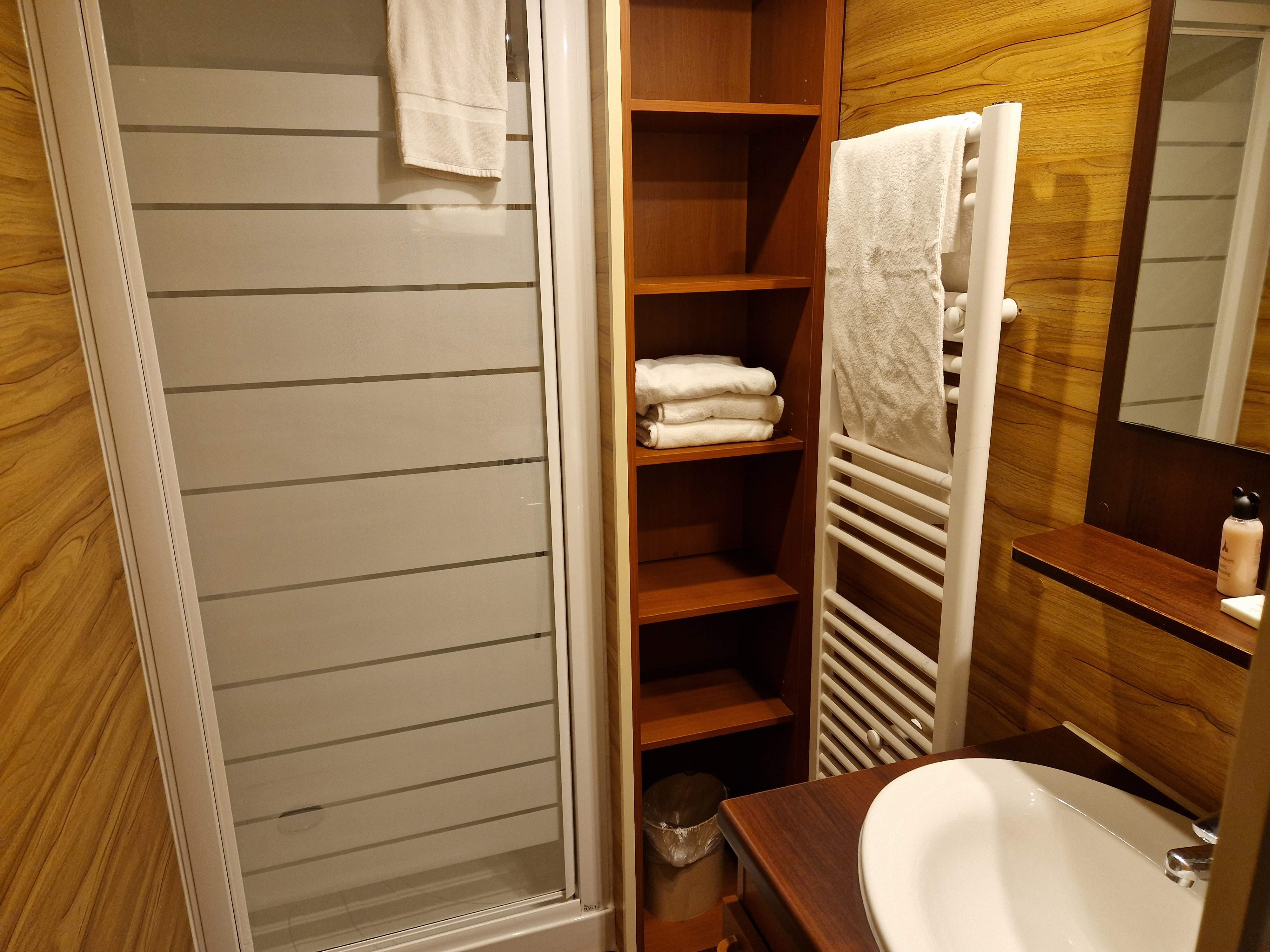 Stepping inside – after unlocking the cabin with your real (read: metal) key – you first enter the living space. This living room/kitchen features a sofa bed, dining table (with space for six), and a small kitchen. This area is a great space to hang out and decompress after a busy day at the theme parks. We made good use of the microwave for late-night snacks, as well as storing all of our cheap drinks in the fridge! It’s worth noting, however, that there is no oven provided. Just a microwave and a hob, so don’t plan anything too adventurous! If you were planning on using the kitchen, also note that whilst a dishwasher is provided, no cleaning supplies are at all, so you’ll need your own washing-up liquid or tablets. It was such a nice change to have these facilities at our disposal throughout the stay, and it really did help keep costs down a little. The kitchen and dining table were both in good shape, but sadly, the sofa was extremely tired and sunken. It just really wasn’t comfortable to spend much time on at all, but it did the job at midnight after a fifteen-hour park day, that’s for sure! We also made good use of the provided laundry rack. Having been caught in a Parisian downpour, the ability to get all of our clothes on the line was a godsend.