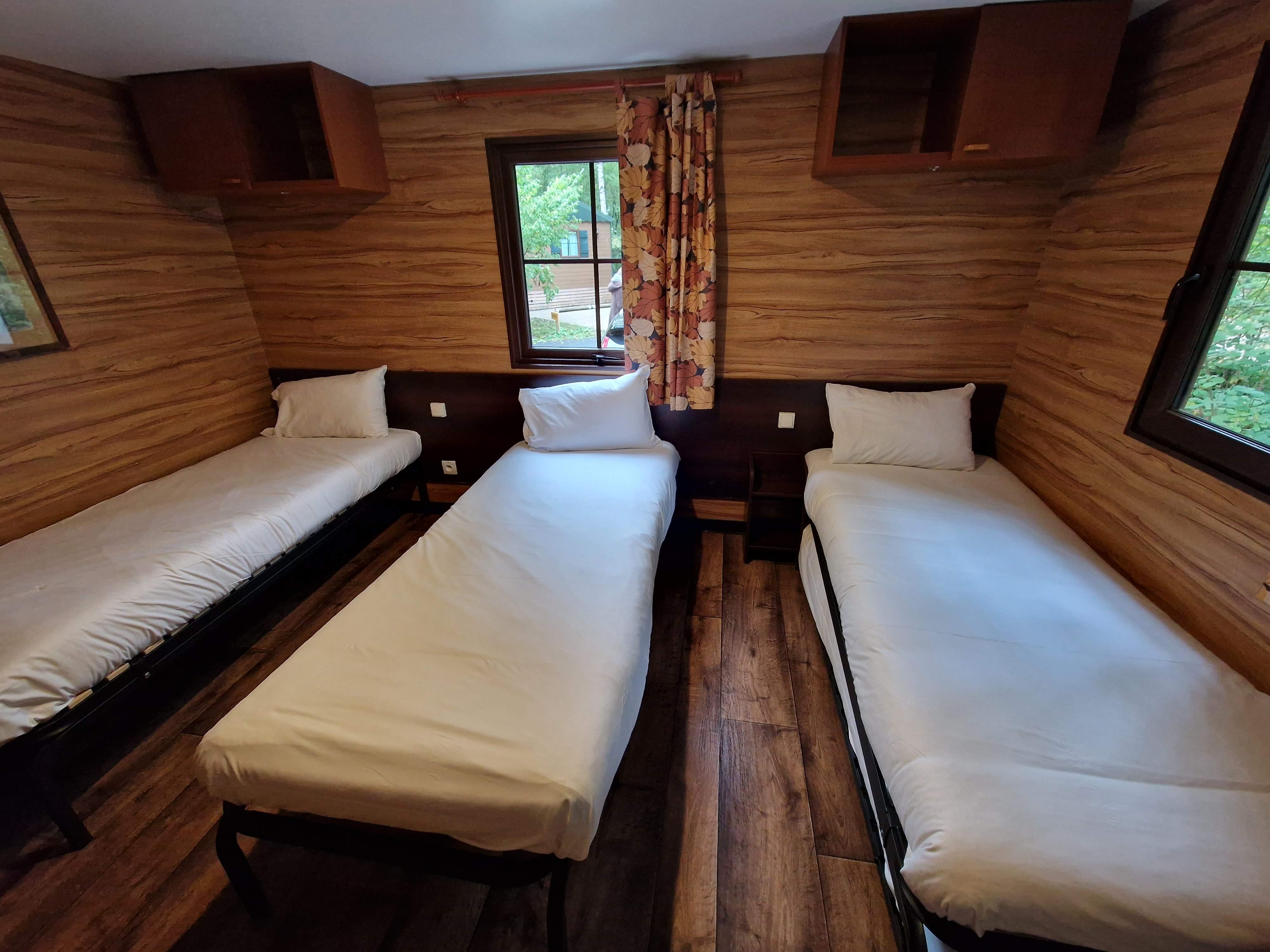 On either side of the living space are the bedrooms. There are two, one features a double bed and the other contains three single beds. As a young-ish adult, the first thing that comes to mind when I see this number of single beds is how cheaply you could do a trip if you were to pack out all the beds, and yes. That is true. However, these rooms have very little space outside of the beds. So, if everyone were to have luggage, that would be a very tight squeeze indeed. On the other hand, for families – or friend groups who just don’t care that much – who could potentially store luggage in the family space, this should be a breeze. Of the two bedrooms, I slept in the double bed on my own, and even as one person, I found the space a tight squeeze. We were on a longer trip, so I had a medium-sized suitcase, and there was nowhere at all in the room I could store it, apart from wedged down the side of the bed. So I just had to hop over it to get around! However, the cupboards and shelves were great for stashing smaller items. There were also plenty of plugs located near the bed, so I never had any trouble keeping all those theme park essentials powered up. Sadly, I didn’t find the bed very comfortable. Whilst it was a step above a camp bed, it was quite thin and very creaky! I definitely found myself longing for the comfy beds of the regular hotels, though these did at least have the same lovely bedding.