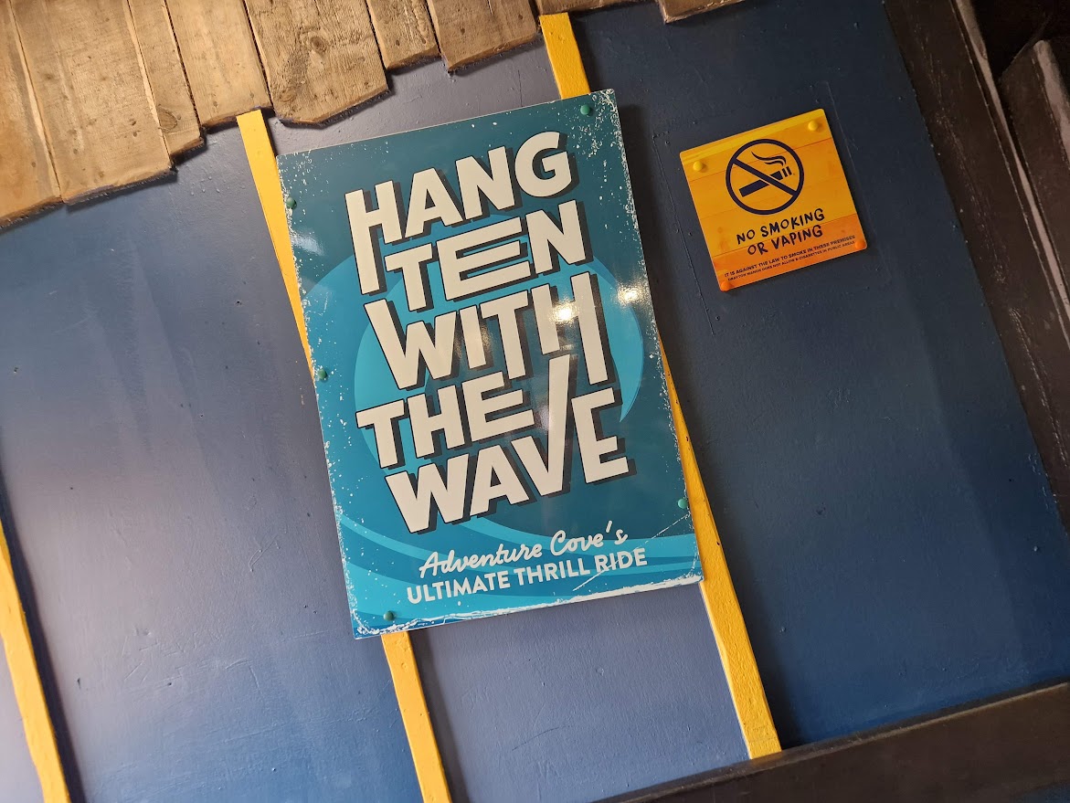 The corner of Adventure Cove that houses The Wave has seen a lot of theming added to mark the new attraction. Most eye-catching of this is, of course, the enormous head-chopper billboard placed over the straight portion of the track. Personally, I like this billboard a lot more in person than I did in photos! I do find billboards a slightly lazy way to provide a headchopper moment, but given the limited budget of the re-theme, this works really well! In front of this sits the massive portal for the ride. Featuring a massive surfboard, flag, and lifeguard cabin, this bright archway makes the ride entrance absolutely unmissable! I’d love to see a little more work on this portal in the future to bring the colours in line with the attraction’s station building – and also to amend that greyed out window, not a fan – but it’s certainly an eye-catching entrance!