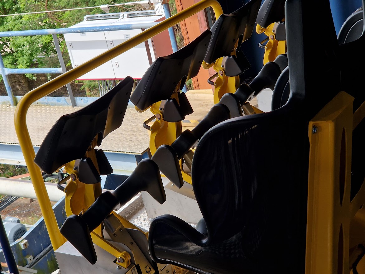 Okay, we’re all thinking it, so I’ll just say it. These trains are not pretty. In fact, they resemble a prototype that someone’s thrown together from a few spare bits of metal in the scrapyard. Why there’s no zero car, no branding, no style choices whatsoever, who knows. Well, okay, it’s almost definitely budget. And the bizarre rail at the front? I can only guess that this is a safety feature given that it seems to line up nicely with the gates in the station, but jeez. Thankfully, looks aren’t everything, and these trains are comfy! Like many coaster fans, I’ve had my legs pinned down by the infamous RMC trains, so at first glance, those shin guards are a little… intimidating. I’m happy to say, however, that I didn’t feel them at all. In fact, that part of the restraint could not have been there for all I noticed. The lap bar, too, is nice and comfy, but prepare for it to be pushed down hard! Usually, I wouldn’t be a huge fan of this stapling, but with the way the restraint sits on my legs, I really, really was – but more on that later!