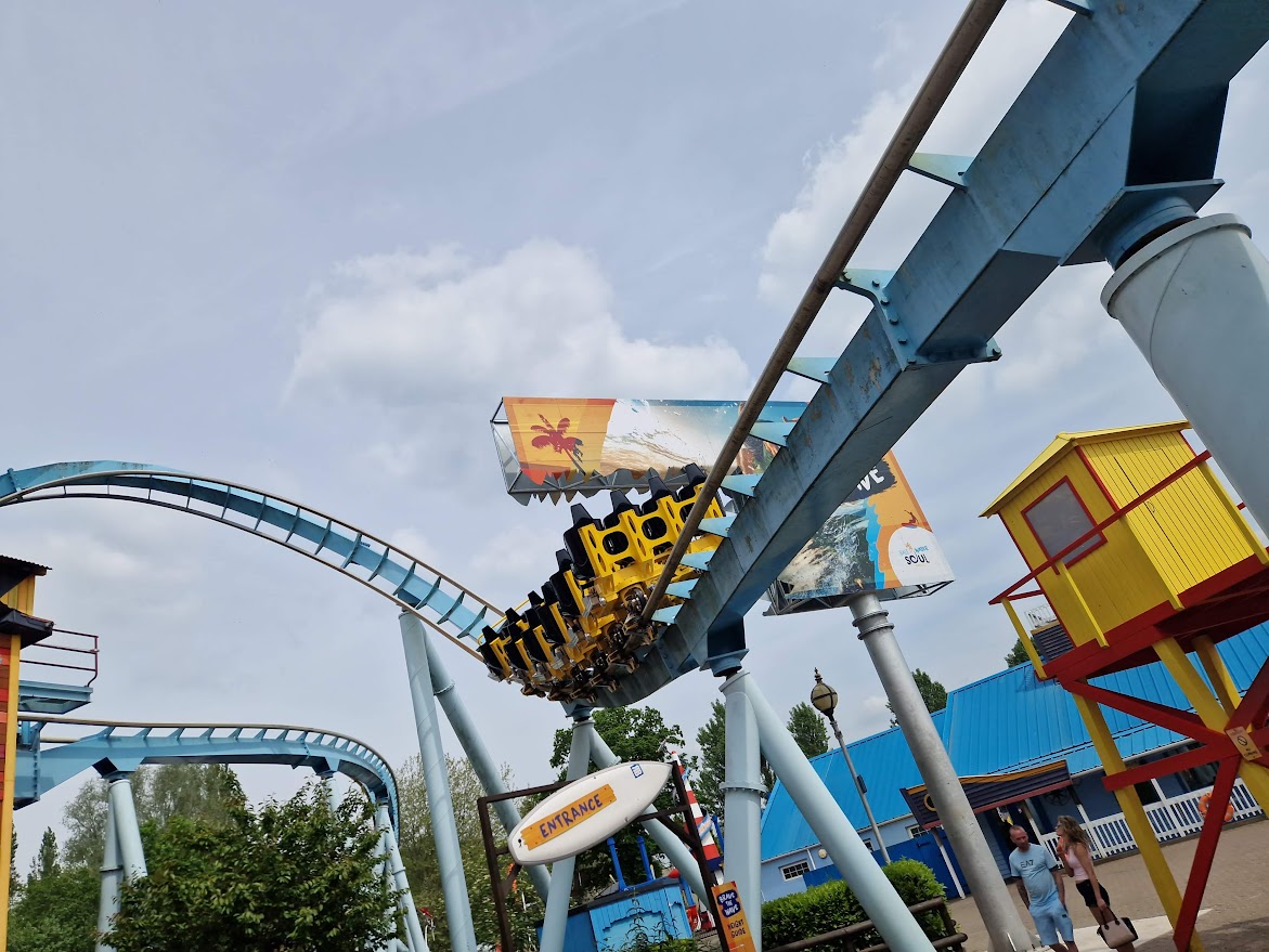 Securely stapled into place, it was time to brave The Wave! As mentioned previously, the anti-rollback system on this train is loud, almost deafening in fact, as you ascend that lift hill. But I kinda like it! Nothing screams ‘I’m on a roller coaster!’ more than a good clack clack clack. As soon as you crest that initial drop and start the curve round to the vertical loop, there’s a very sudden realisation of just how free you are. On me, the restraint did not touch my abdomen whatsoever, sitting happily on the top of my thighs. It almost felt too free. Surely this couldn’t be enough to hold me in?! Of course it is, but lord does it add to the thrill! This really truly hits as you enter the loop itself. The intensity of this element is variable across the rows, with the rear of the train being far milder, but on the front row? I was folded in half like a sheet! I can’t really remember being pushed so hard over a lap bar before. It was wild!