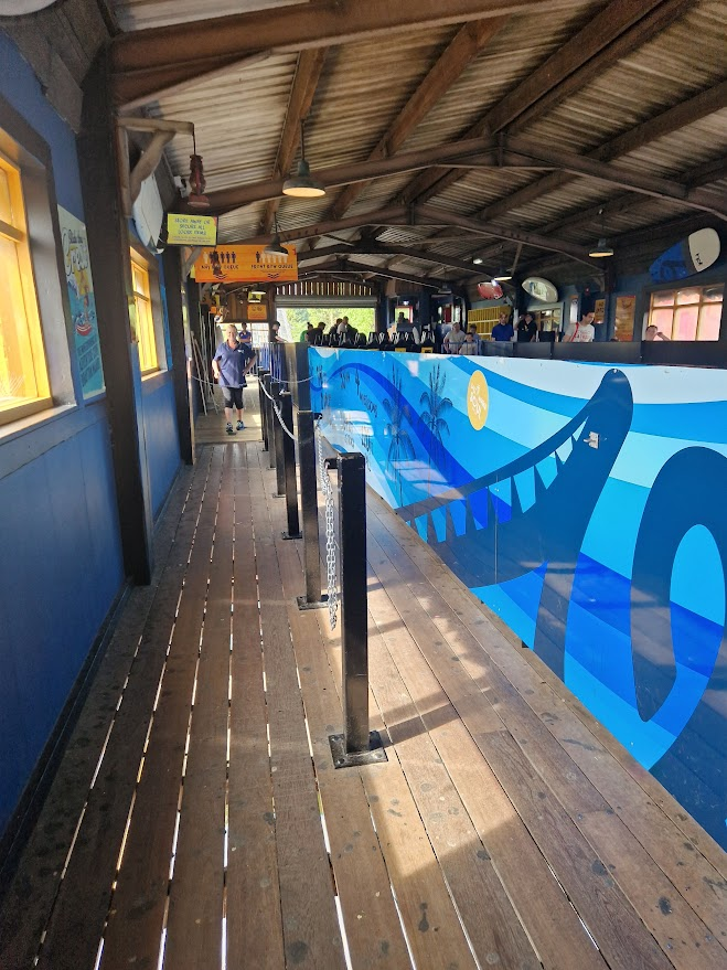 Inside, the queue layout has remained the same, but with a lick of paint and new signage throughout. A lot of signage. All of it different, and referencing the park and Adventure Cove in different ways. It’s fresh and fun and brightens up a dark corridor as much as possible!