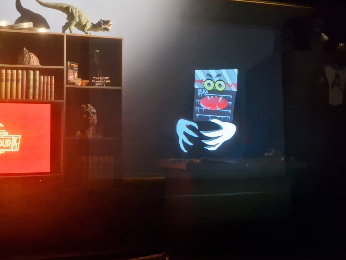 Happily, the highlight of the entire evening was the attraction I was most excited to experience: the Movie Park Studio Tour Halloween overlay! The park’s newest coaster/dark ride closes for a short while at the beginning of the evening to undertake a transformation into Movie Park Studio Tour – Final Cut. With a new pre-show, changed media on the screens – including the appearance of an evil version of the park’s mascot – and a few physical props in the queue, this is a really fun addition to the Halloween line-up. We should know, we rode the spooky version five times! Not by choice mind you, just thanks to some ride ops in full Halloween make-up who would not stop sending the last train of the day! (Note: this version of the attraction is for ages 16+.)
